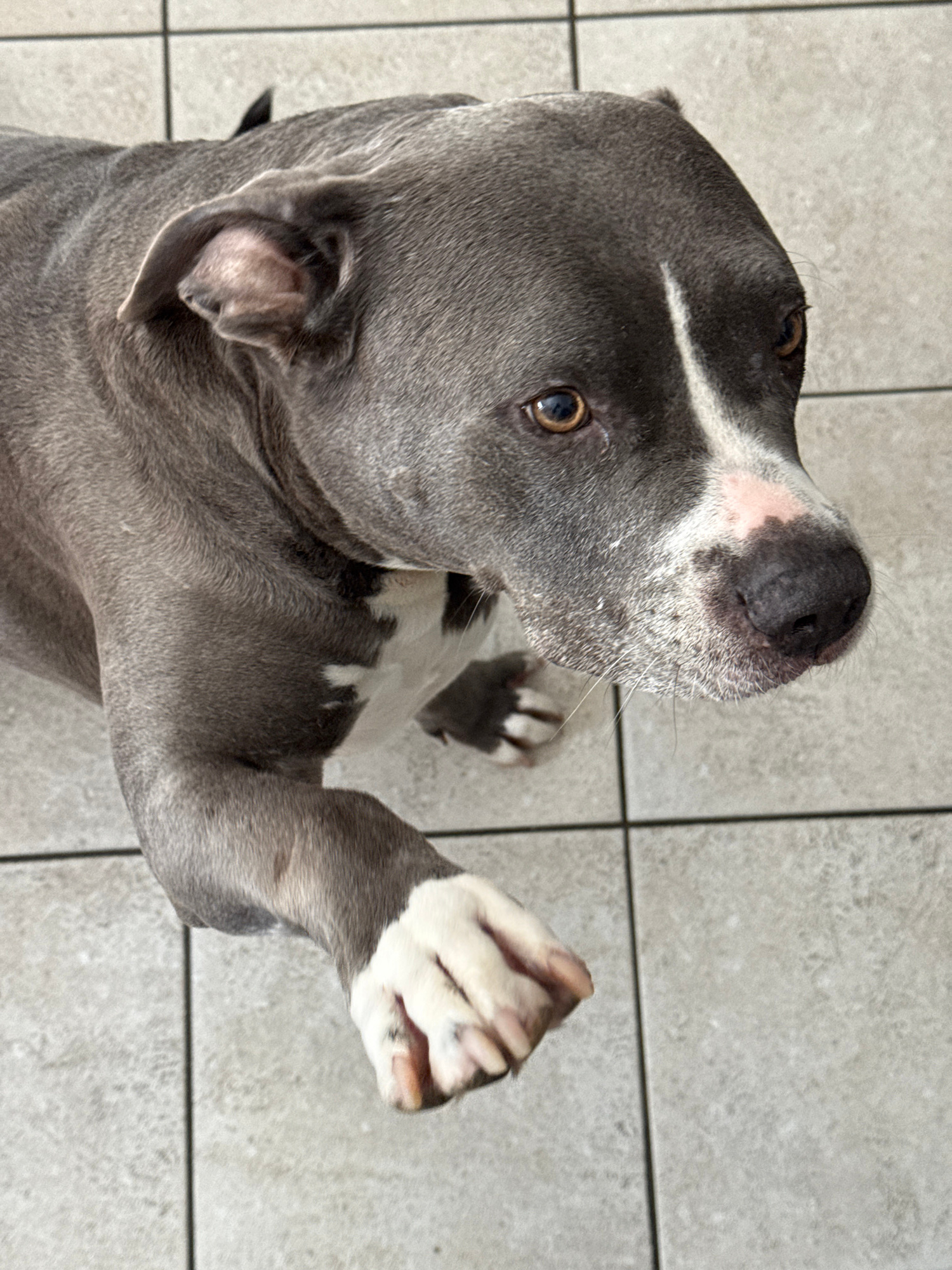 A blue and white pitbull-type dog sits on a gray tiled floor. The dog is looking up with its right paw raised, as if begging or trying to get attention. The dog has short gray fur and a white stripe o…read more