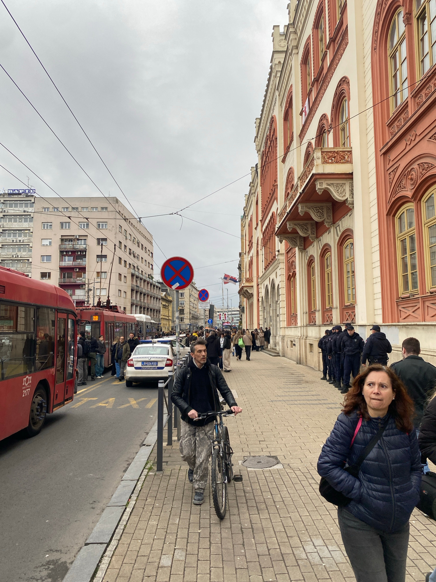 The image shows a street scene in Belgrade, Serbia. A red articulated bus is stopped on the street next to a white police car. On the sidewalk, a man on a bicycle is walking, and a woman in a blue jac…read more