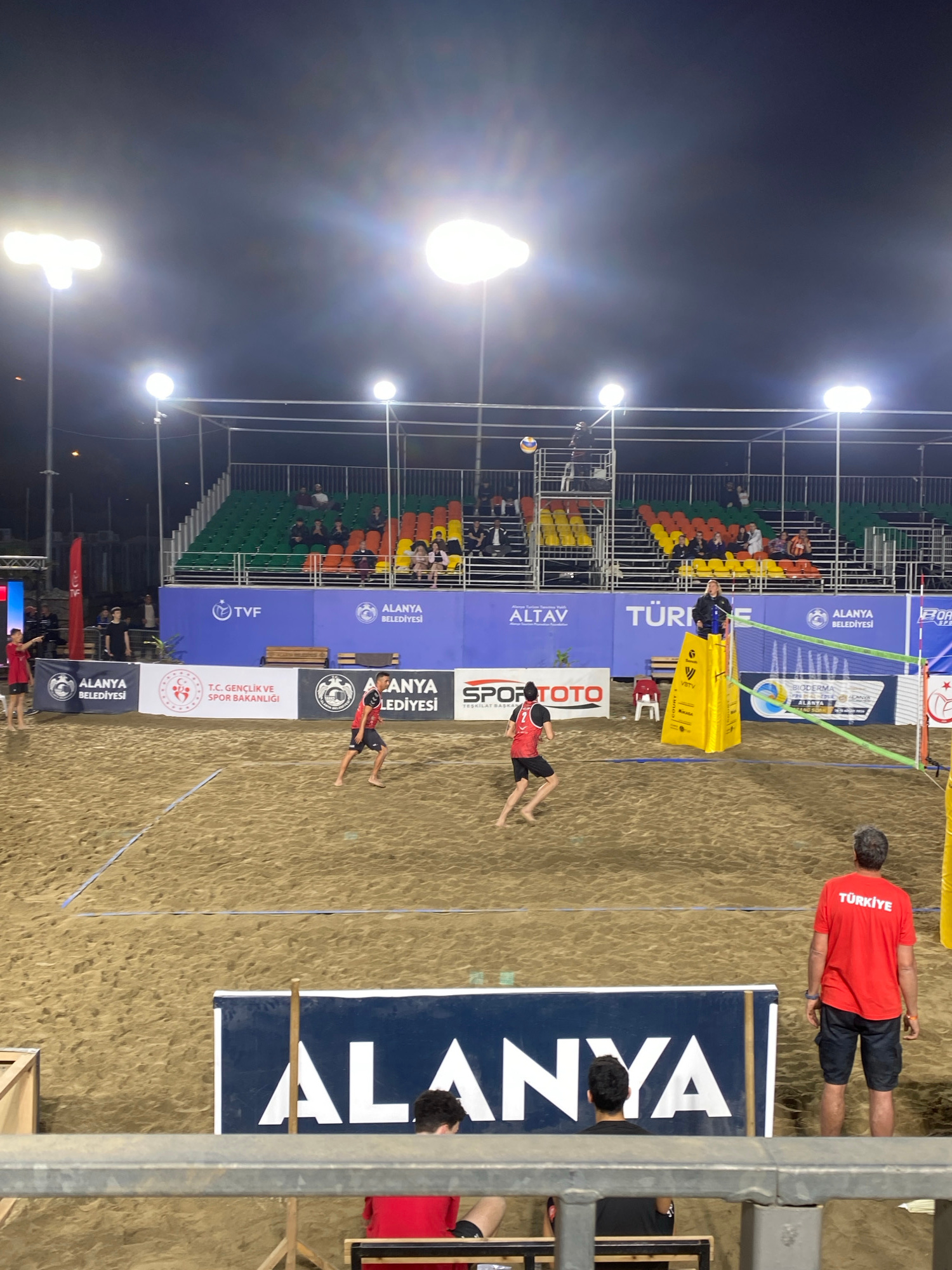 The image shows a beach volleyball game in Alanya, Turkey, at night. The sand court is illuminated by bright overhead lights. Two players in red and black uniforms are in the middle of a play, while a…read more