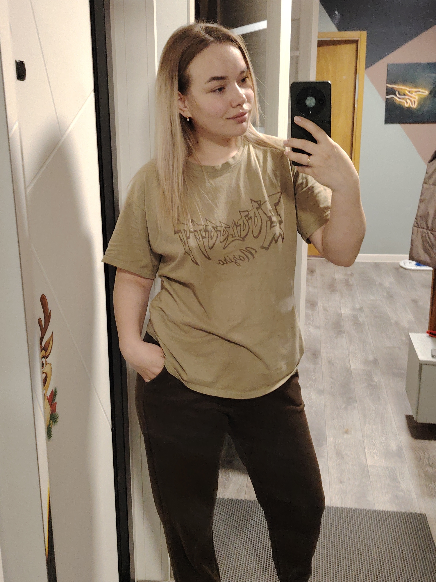 A young woman with blond hair takes a selfie in a hallway. She is wearing a khaki-colored t-shirt with a logo and dark brown sweatpants. Her left hand is in her pocket, and her right hand holds a smar…read more
