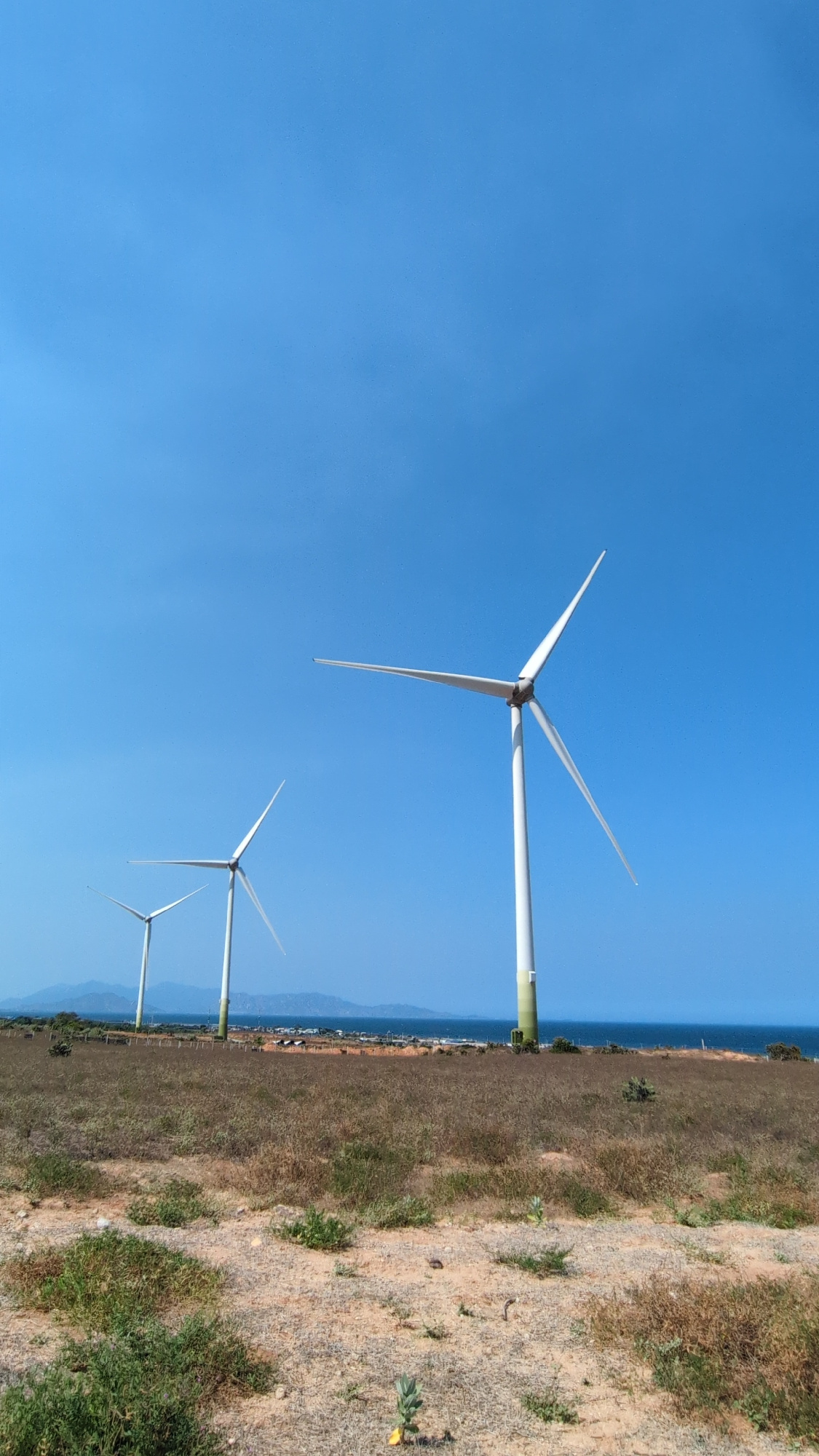 The image shows three wind turbines on a grassy hillside in Phuoc Dinh, Vietnam. The sky is clear and blue. The turbines are white, with green bands at the base of the largest turbine's tower. The gro…read more