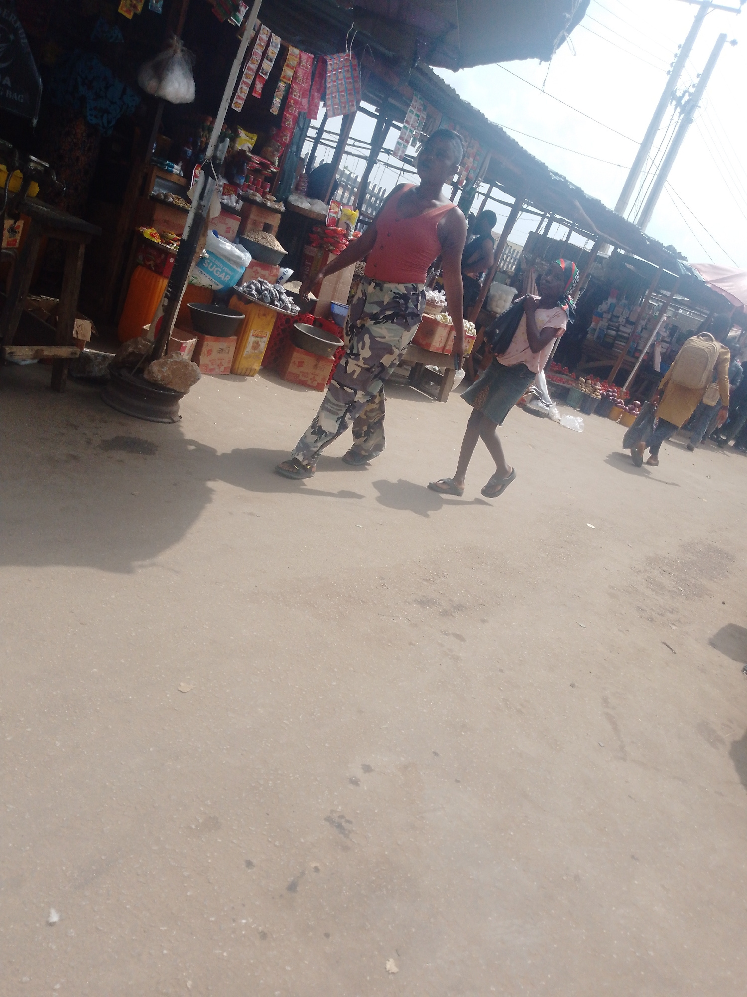 The image depicts a street scene in what appears to be a market area. The location is Unknown, Unknown. A woman wearing a red tank top and camouflage pants is walking, and a young girl with a backpack…read more