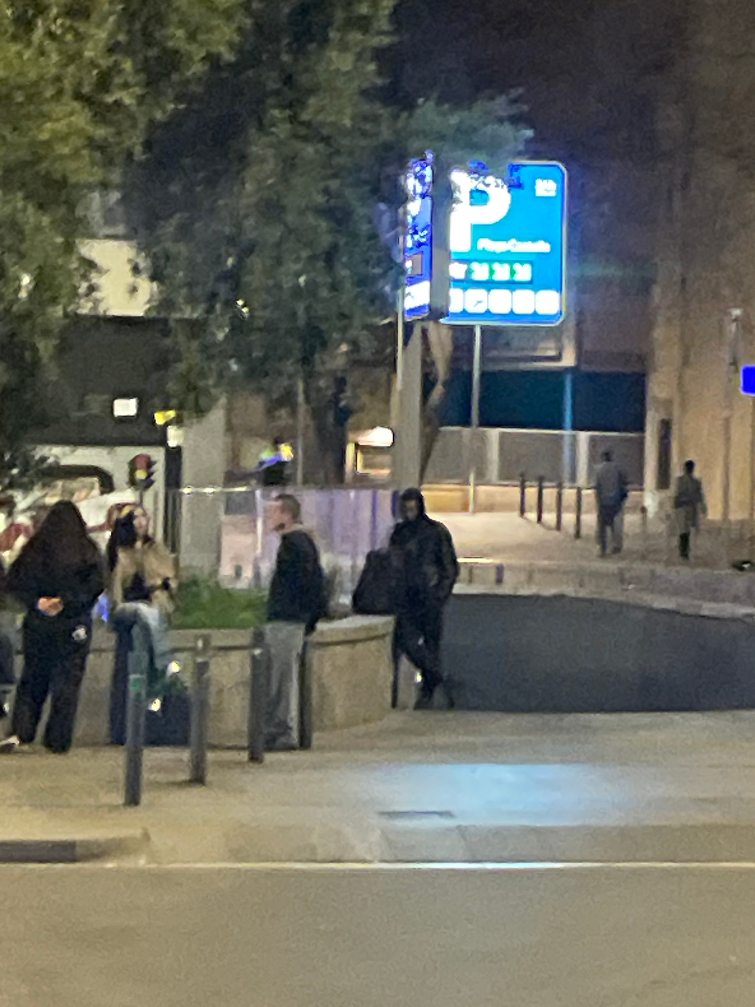 The image depicts a street scene at night in Barcelona, Spain. Several individuals, likely tourists or residents, are present. Some are walking along the sidewalk, while others are sitting on or nearβ¦read more