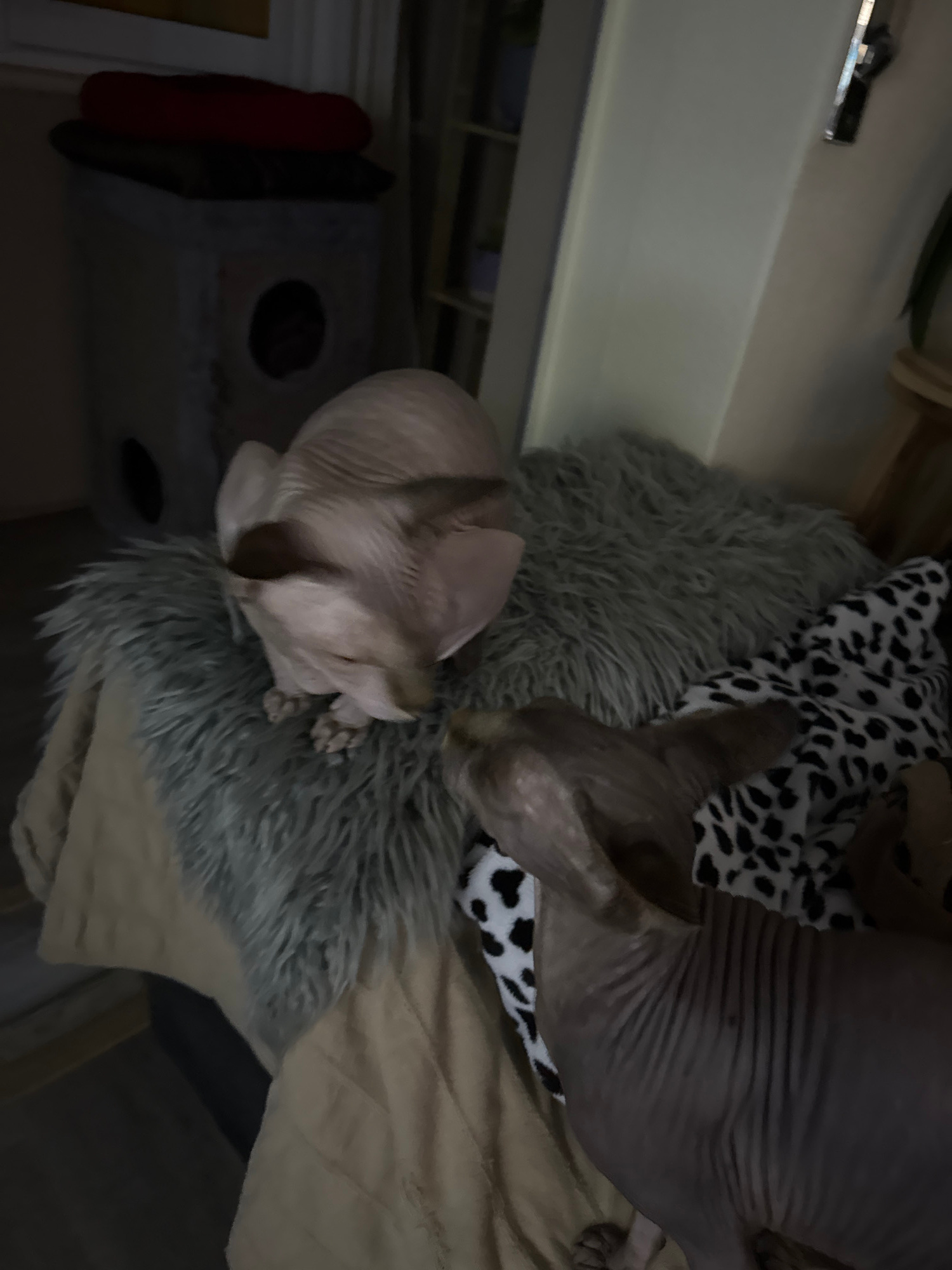 Two hairless cats are resting on a gray fluffy pillow. The pillow is placed on a beige blanket with a black-and-white spotted cloth underneath. The scene is indoors, next to a white wall and a cat con…read more