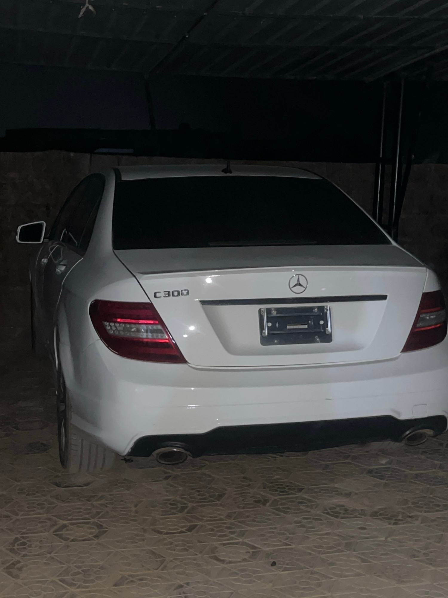 A white Mercedes C300 car is parked near a wall in an enclosed area. The location appears to be Jos, Nigeria, based on the style of the wall. The focus is on the rear of the car, showing the license p…read more