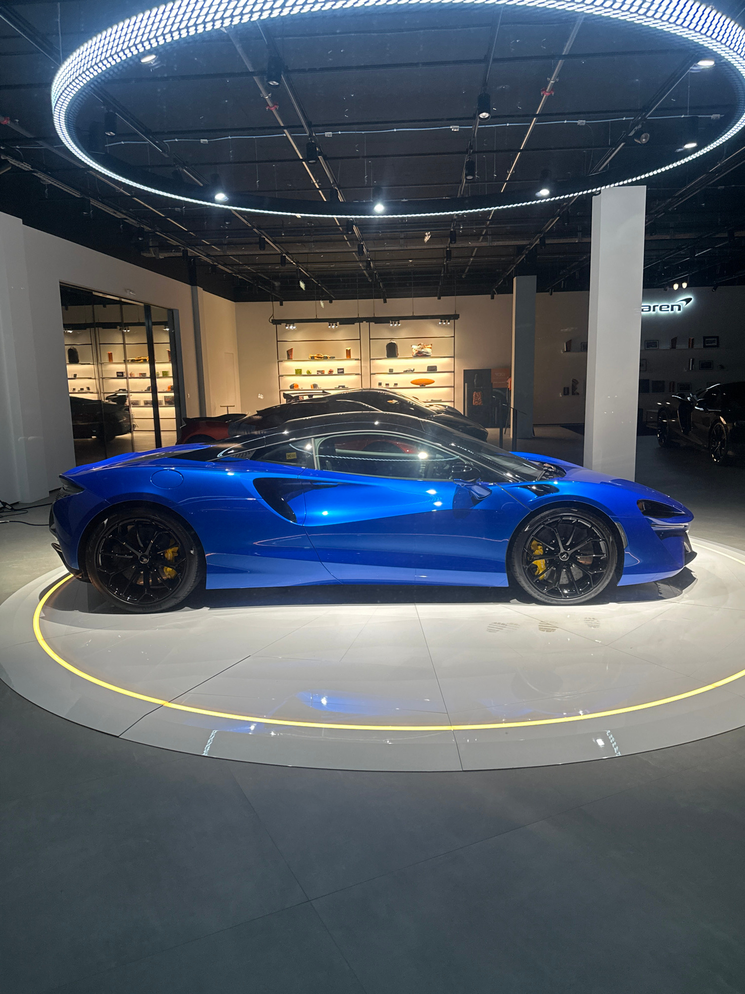 The image shows a blue McLaren sports car on a circular platform with a yellow outline. The car is positioned at an angle relative to the camera. The location appears to be a McLaren dealership, as th…read more