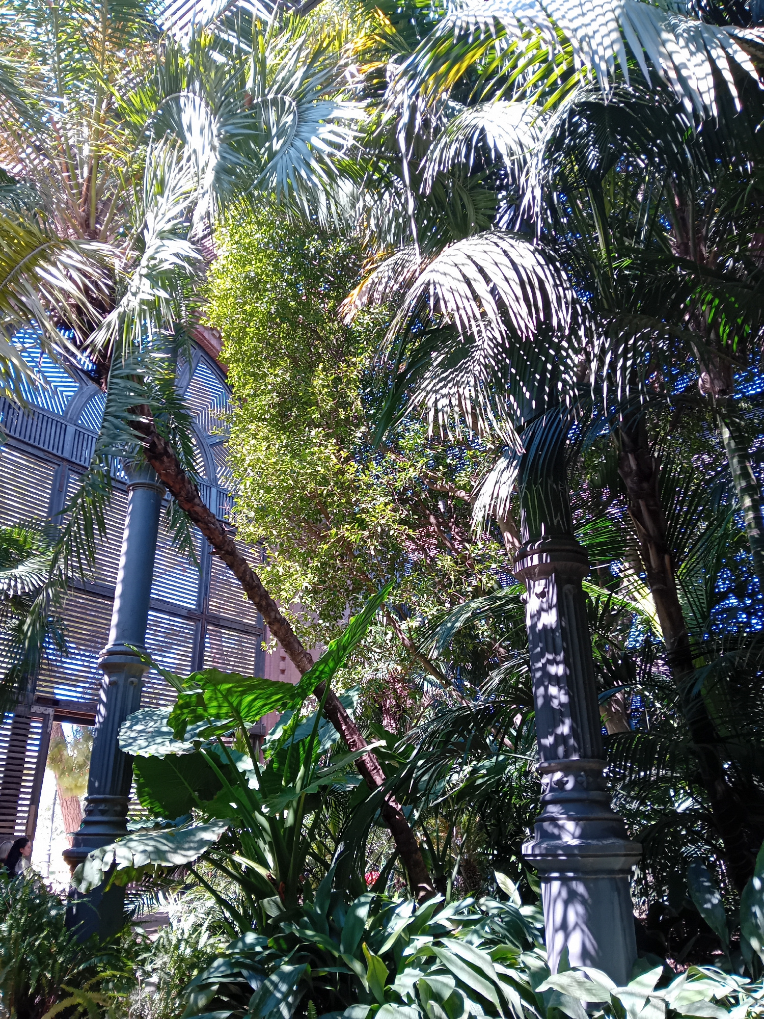 The image shows a view looking up into a dense canopy of palm trees and other foliage. Sunlight filters through the leaves, creating a dappled effect. In the foreground, there are ornate, possibly wro…read more