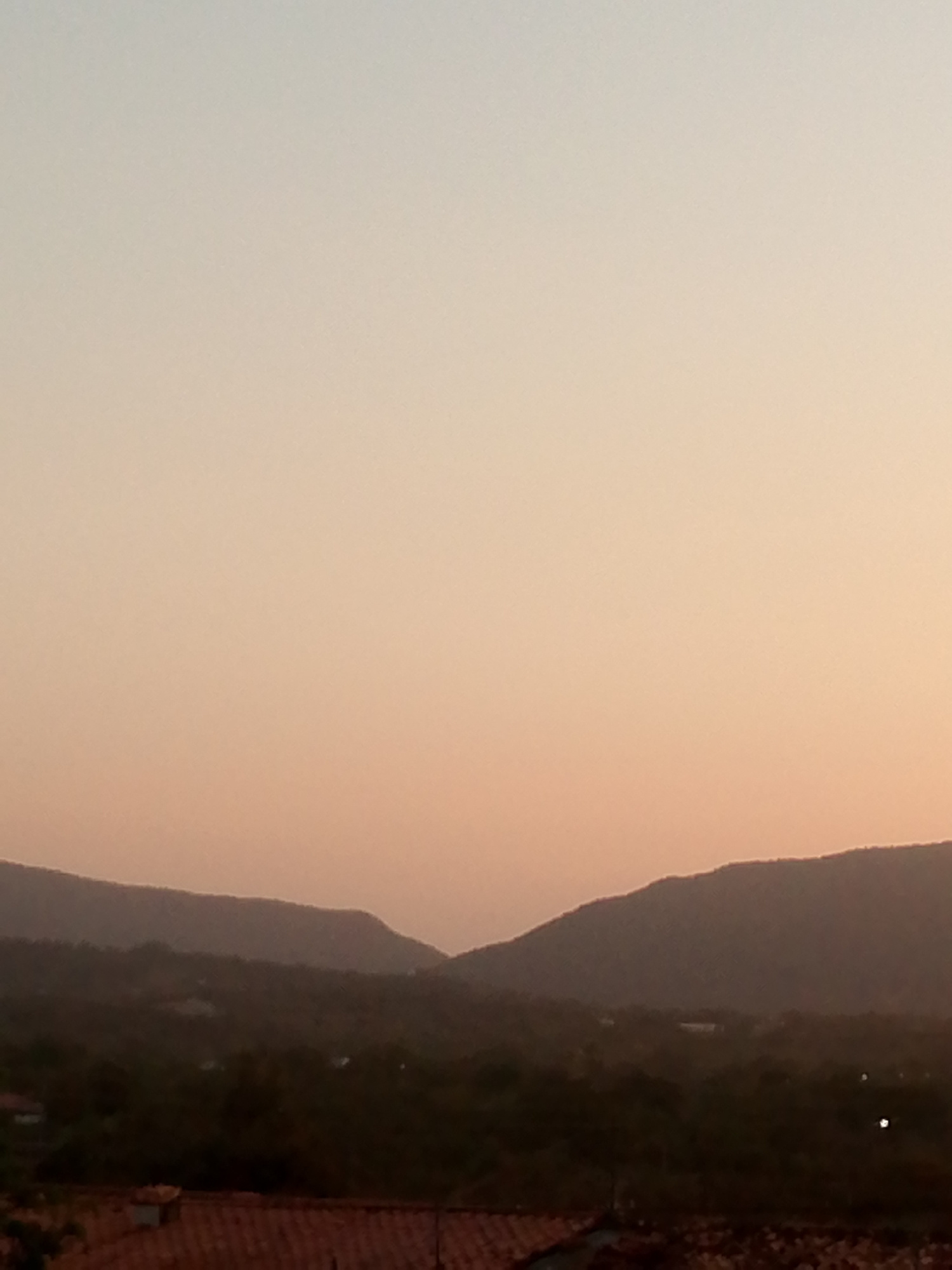 The image captures a view of mountains and vegetation near Juan Griego, Venezuela, during a sunset. The sky is a gradient of orange and light tan, indicating twilight. The mountains are dark silhouett…read more