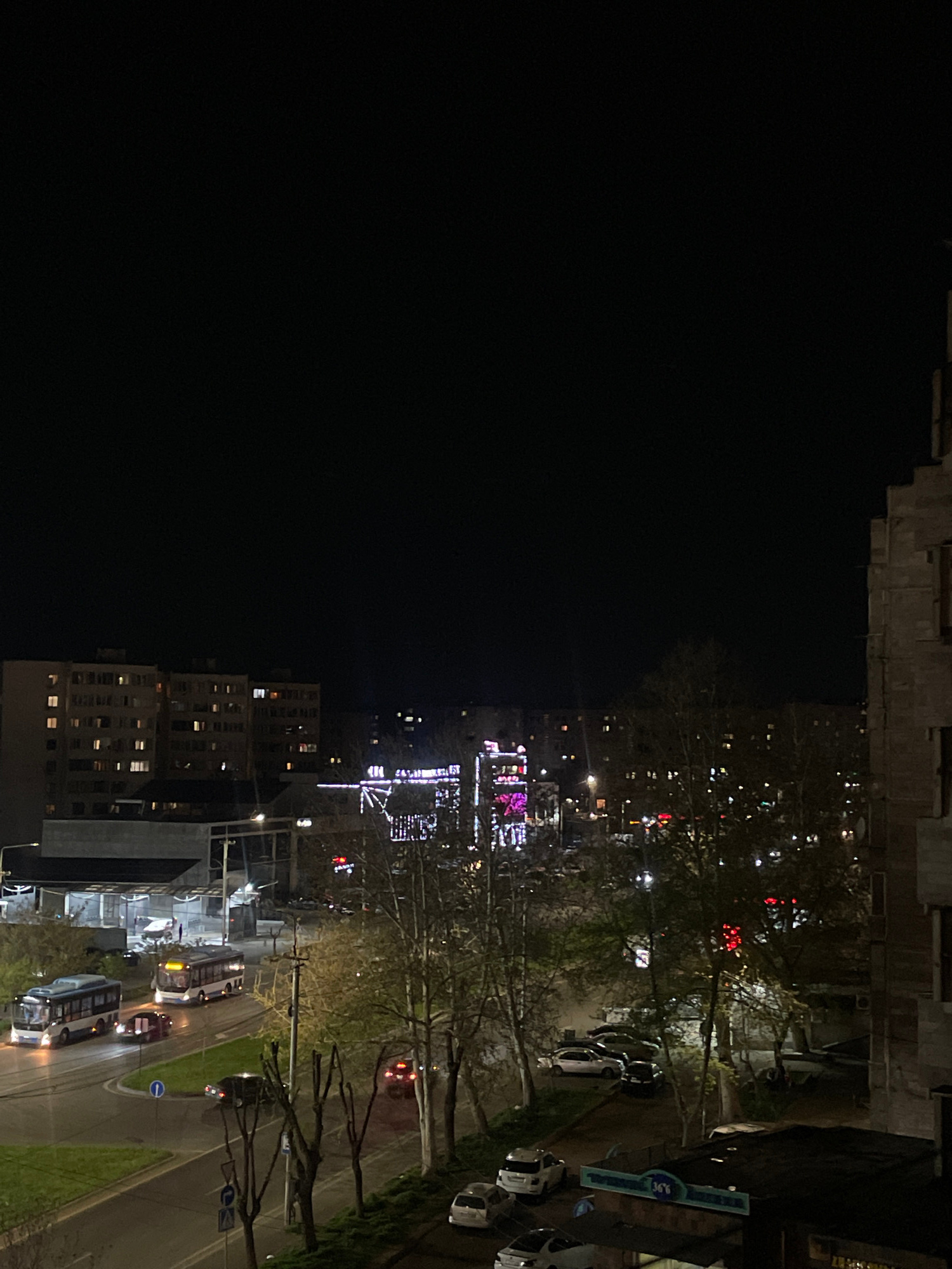 A night view from a high vantage point over Yerevan, Armenia. The lower portion of the image shows illuminated apartment buildings, streetlights, and traffic including buses and cars moving along a roβ¦read more