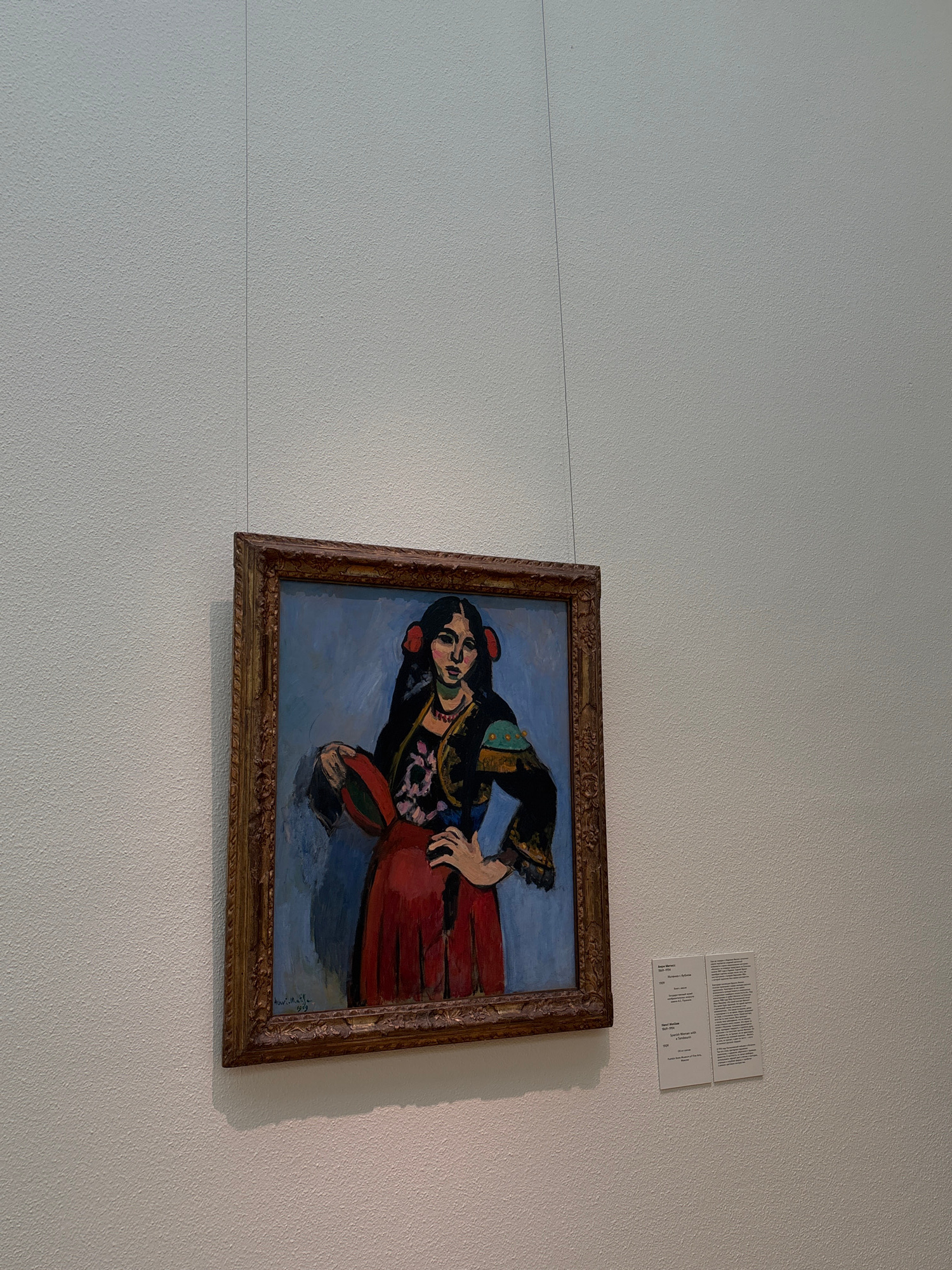 A color photograph taken at eye-level shows a painting hanging on a white wall with a small printed description of the artwork in Moscow, Russia. The painting, framed in an ornate gold-toned frame, de…read more