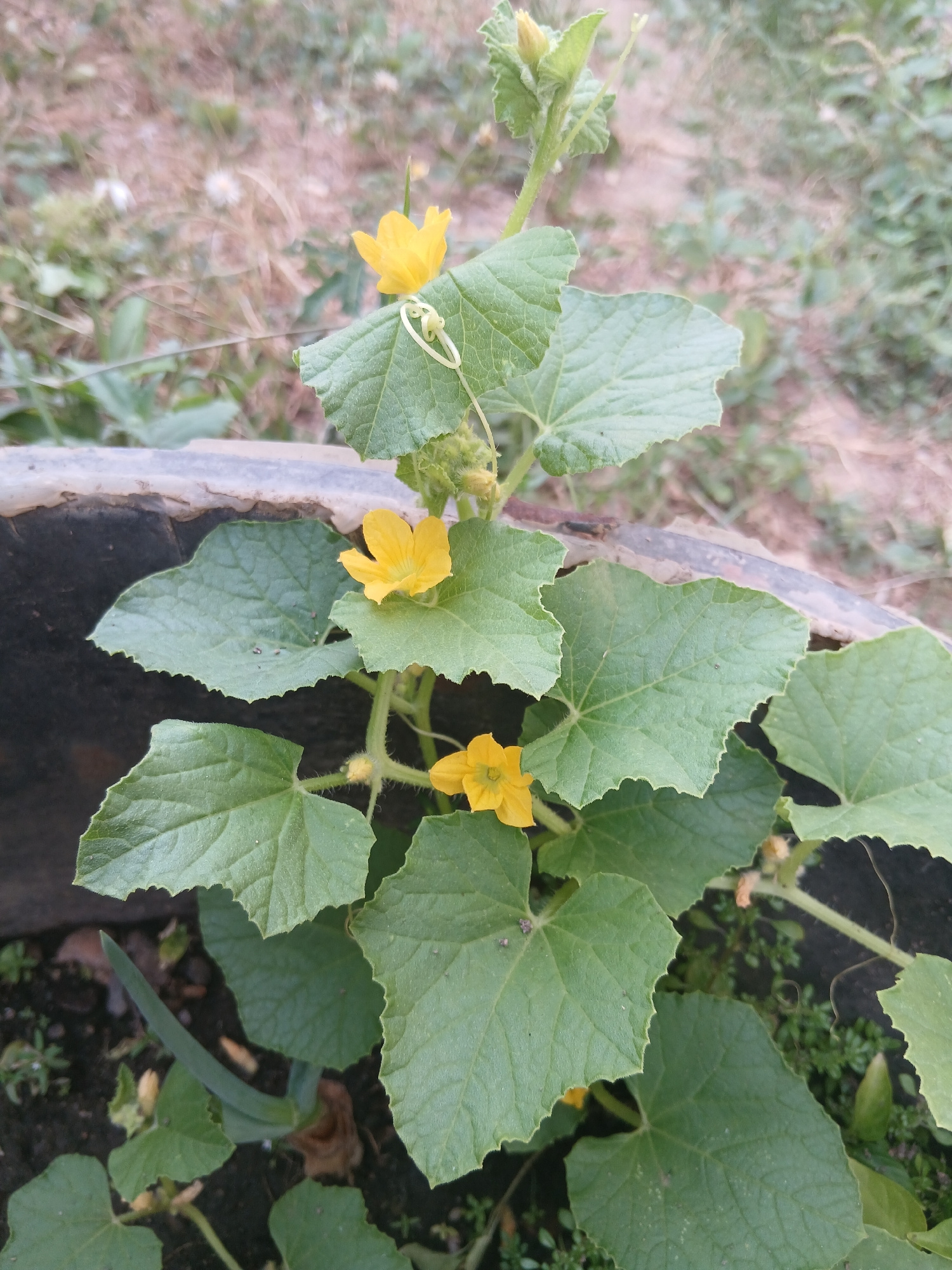 A close-up, slightly high-angle shot shows a plant with green, lobed leaves and yellow flowers, likely a type of melon or cucumber. The plant is growing in what appears to be a dark container with a w…read more