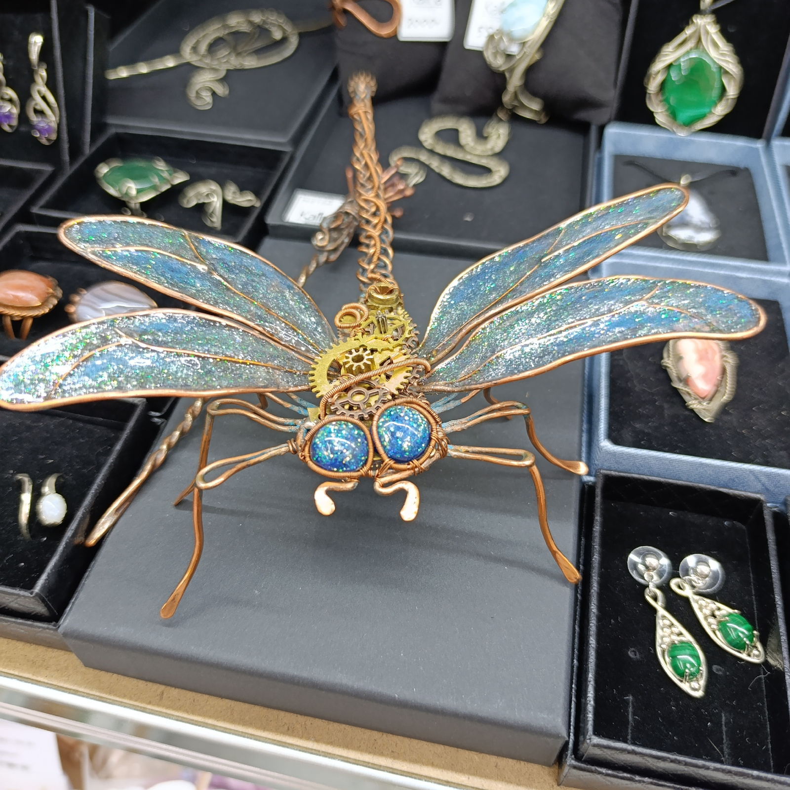 A handcrafted dragonfly ornament made of copper wire, gears, and blue glitter sits in a black jewelry box among other jewelry items in boxes. The dragonfly has wire legs, blue eyes with glitter, gears…read more