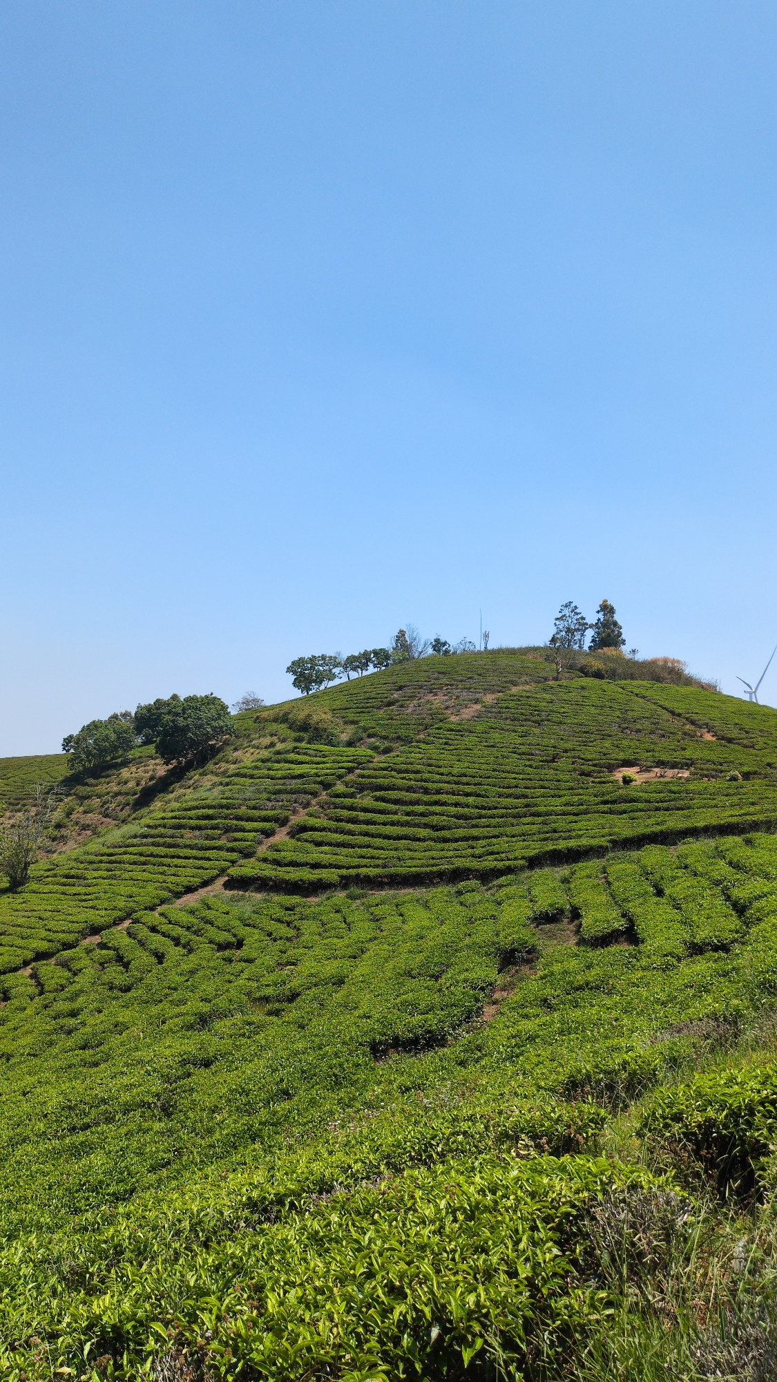 The image shows a sloping hillside covered in rows of vibrant green tea plants under a clear blue sky. The plantation is situated in the city of Trường Thọ, Vietnam, as specified in the prompt. The te…read more