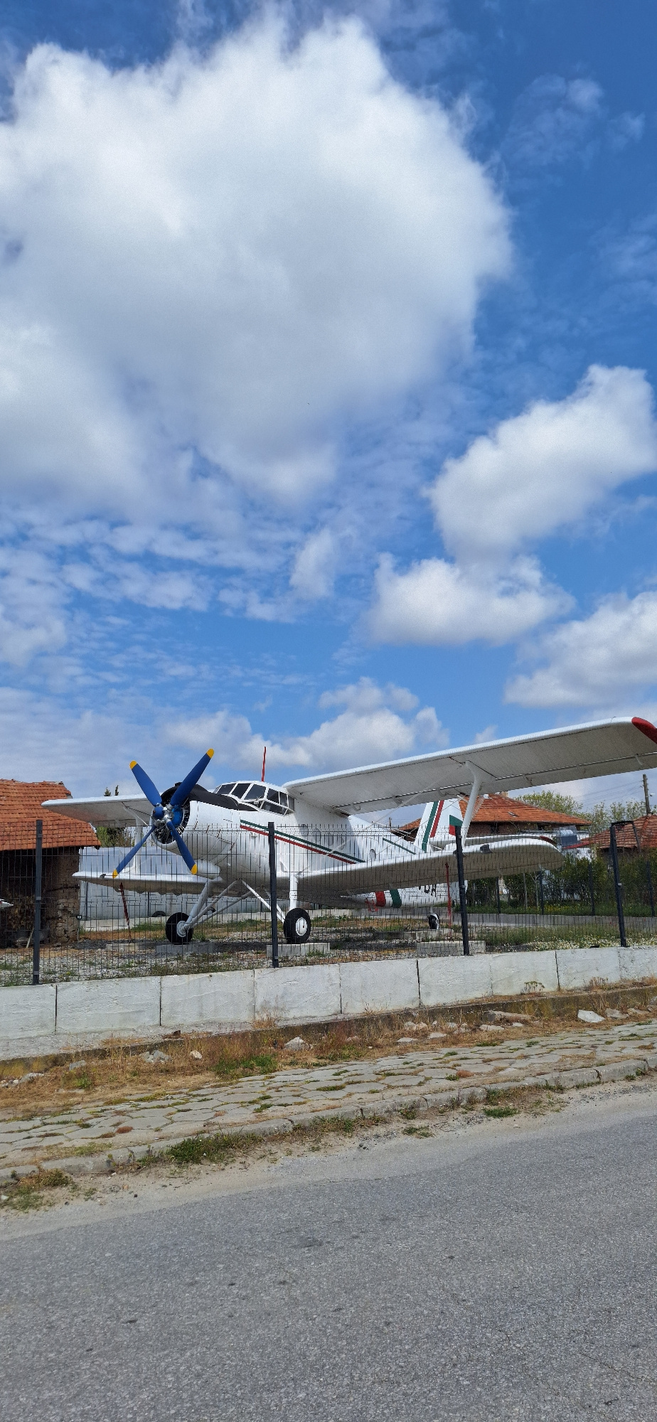 A white biplane with blue propellers is parked in Kapatovo, Bulgaria. The plane is positioned next to a low fence and a concrete curb, with a paved road running adjacent to the curb. The sky, filled w…read more