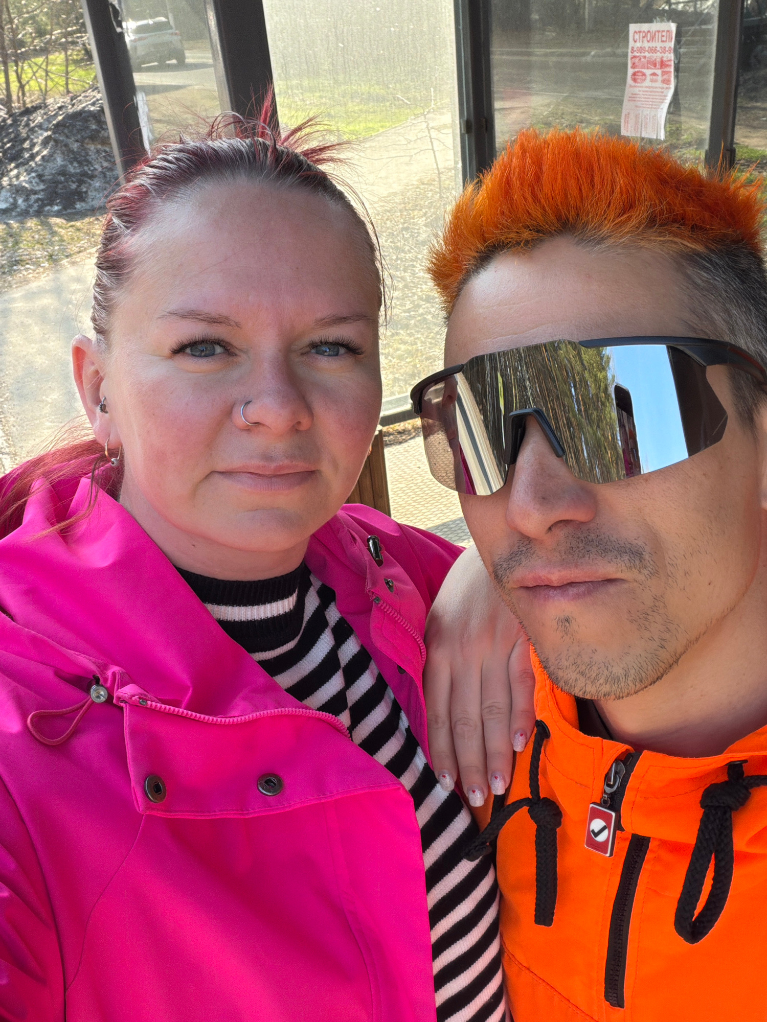 Two individuals pose for a selfie. One person has short, orange-colored hair and wears sunglasses that reflect an outdoor environment with trees and the sky. They are wearing an orange jacket with blaβ¦read more
