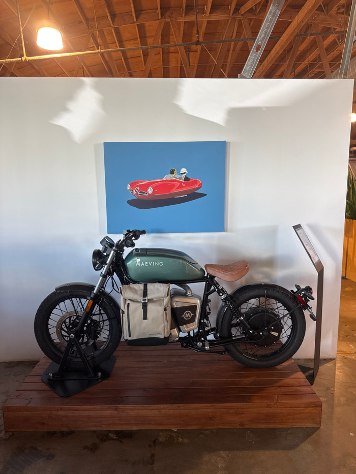 An electric motorcycle is displayed on a wooden stand against a white wall. It features a sage green body, tan seat, and black wheels. Attached are light tan saddlebags. Adjacent to the motorcycle is…read more
