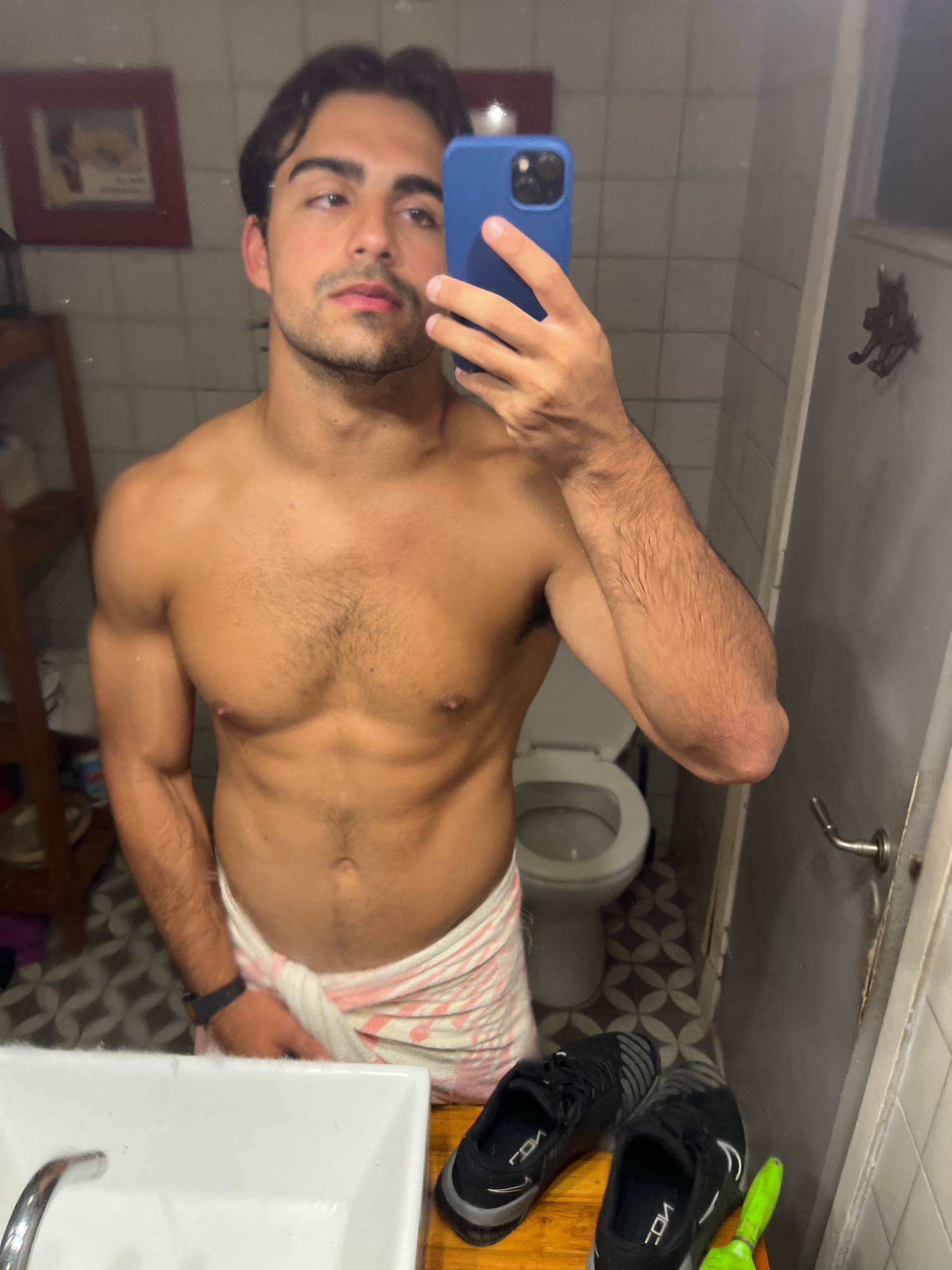 A shirtless male is taking a selfie in a bathroom. He is holding a blue smartphone in his left hand. He is wearing a pink and white striped towel around his waist and a black watch on his left wrist.…read more