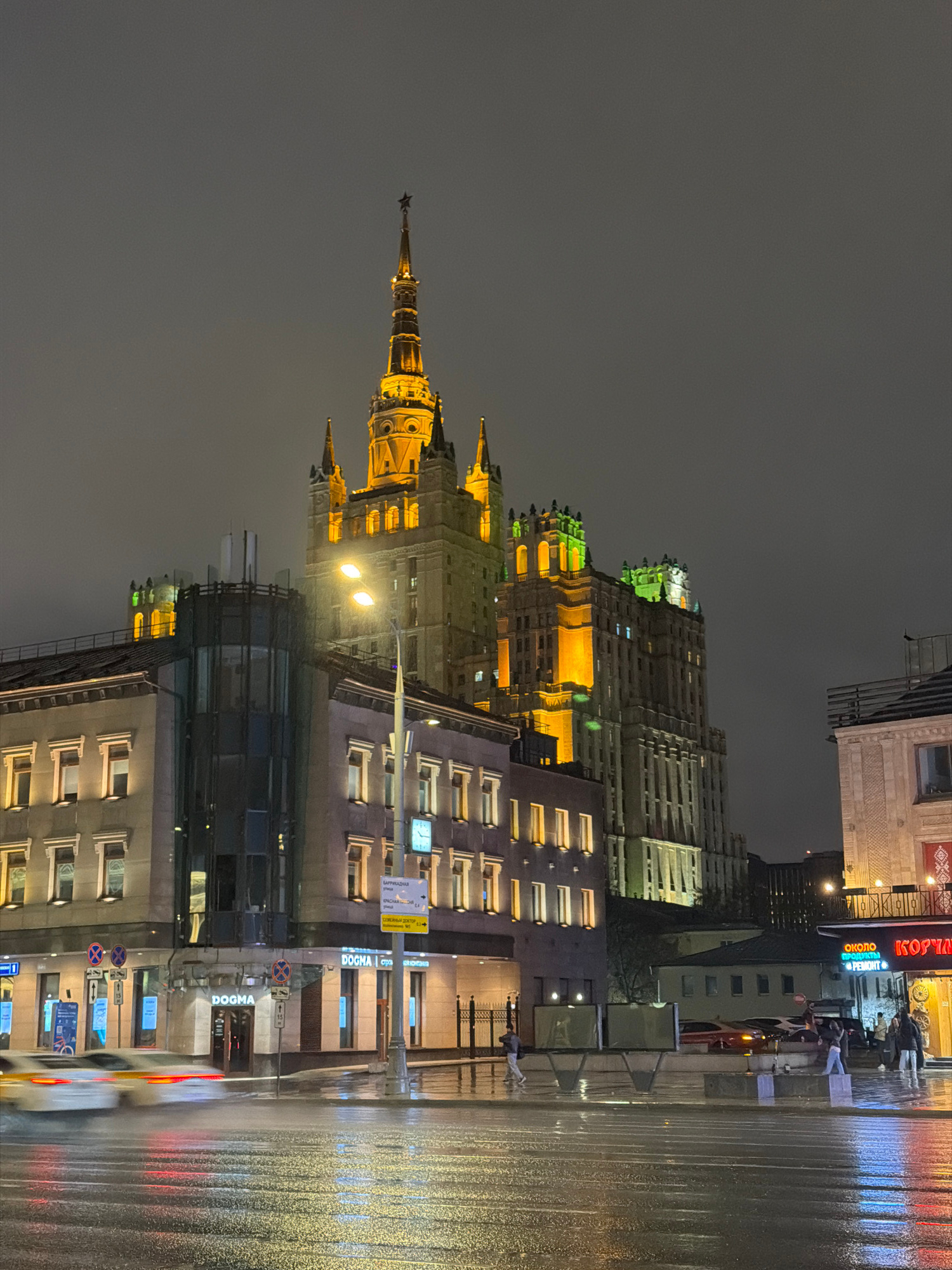 At night, the illuminated Kotelnicheskaya Embankment Building in Moscow, Russia, is seen in a cityscape. The view is captured from street level, with the wet pavement reflecting the city lights. The K…read more