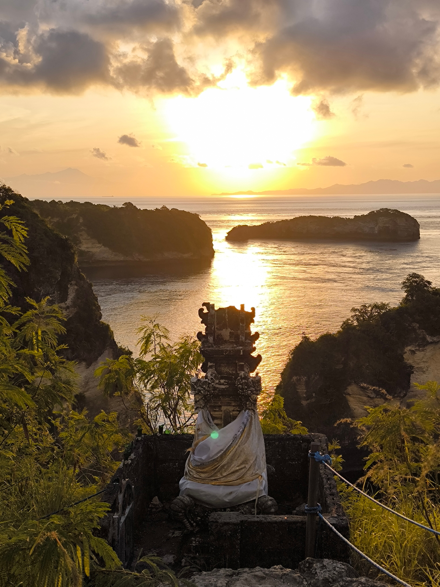 The image captures a sunset view at Nusa Penida, Indonesia, overlooking the ocean and offshore islands. In the foreground stands a stone Balinese shrine adorned with a white and gold cloth, positioned…read more