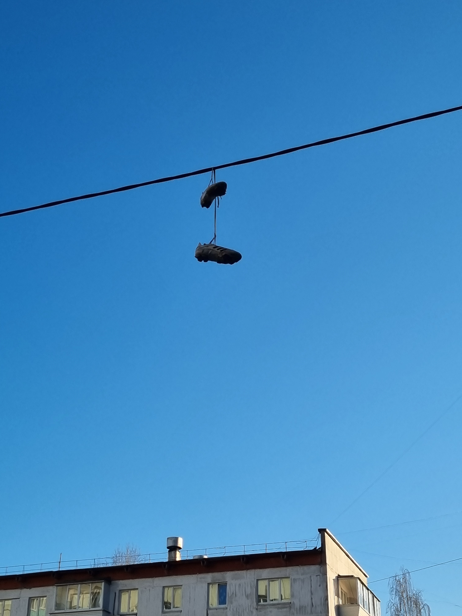 The image captures a clear, upward-looking perspective towards a bright, cloudless blue sky over Chaikovsky, Russia. A thick, dark utility cable stretches diagonally across the frame, from the upper l…read more