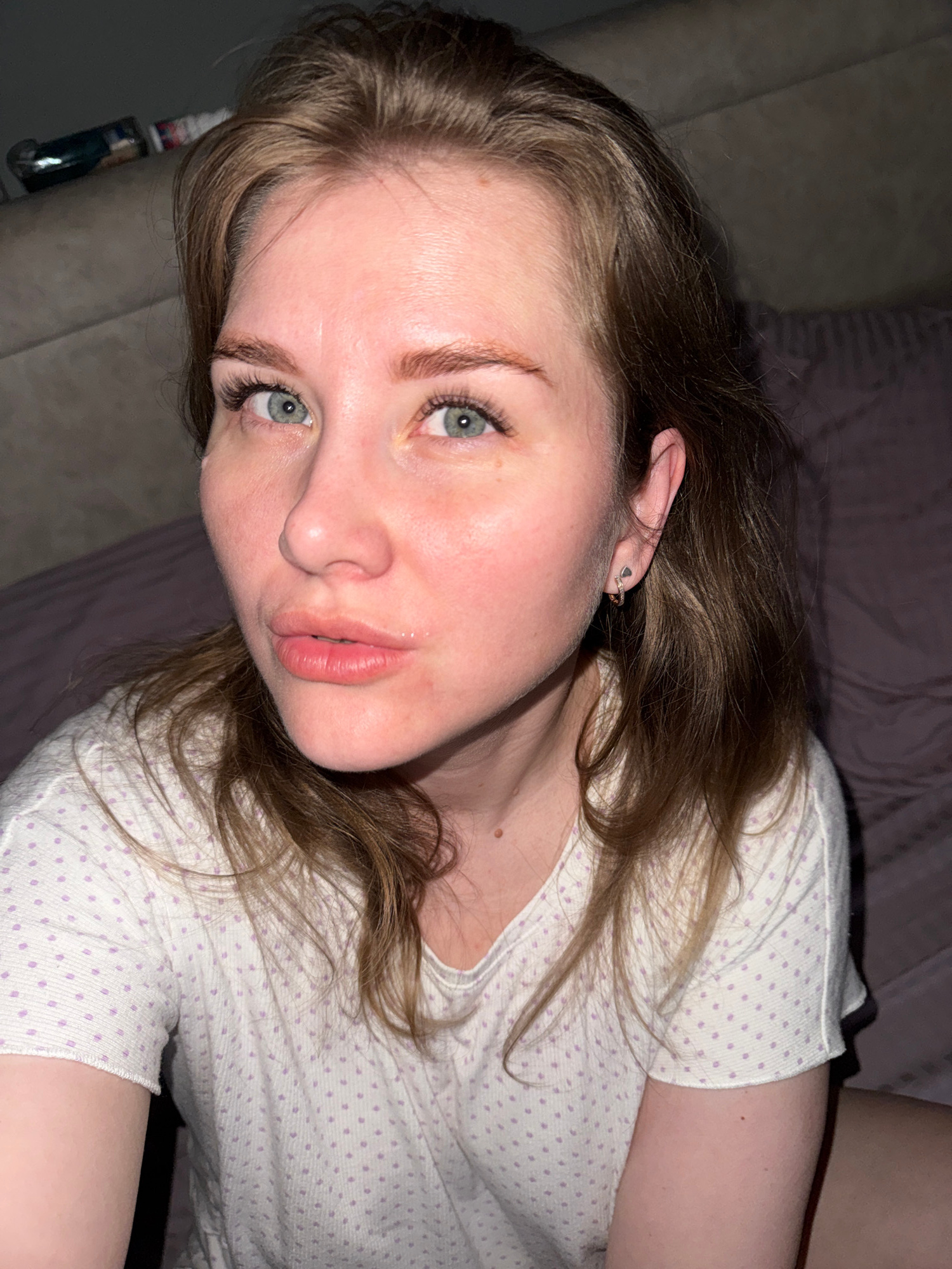 A pale-skinned, blue-eyed woman with brown hair is lying on a grey couch. She is wearing a white t-shirt with small lilac polka dots. Her hair is tousled around her head and shoulders. A silver earrin…read more