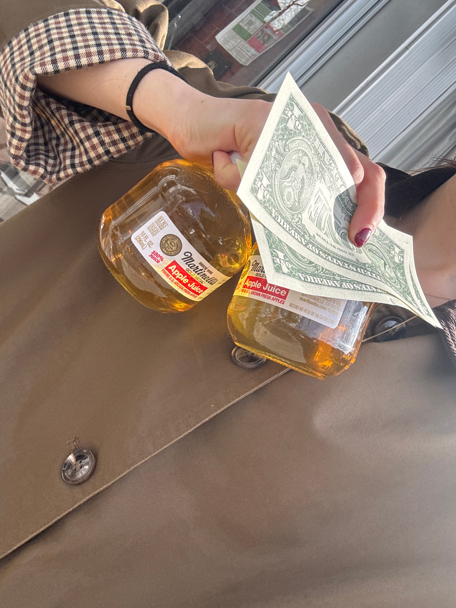 A person wearing a brown coat and a checkered brown and white shirt cuff holds two glass bottles of Martinelli's apple juice and three one-dollar bills. The person appears to be standing outside. The…read more