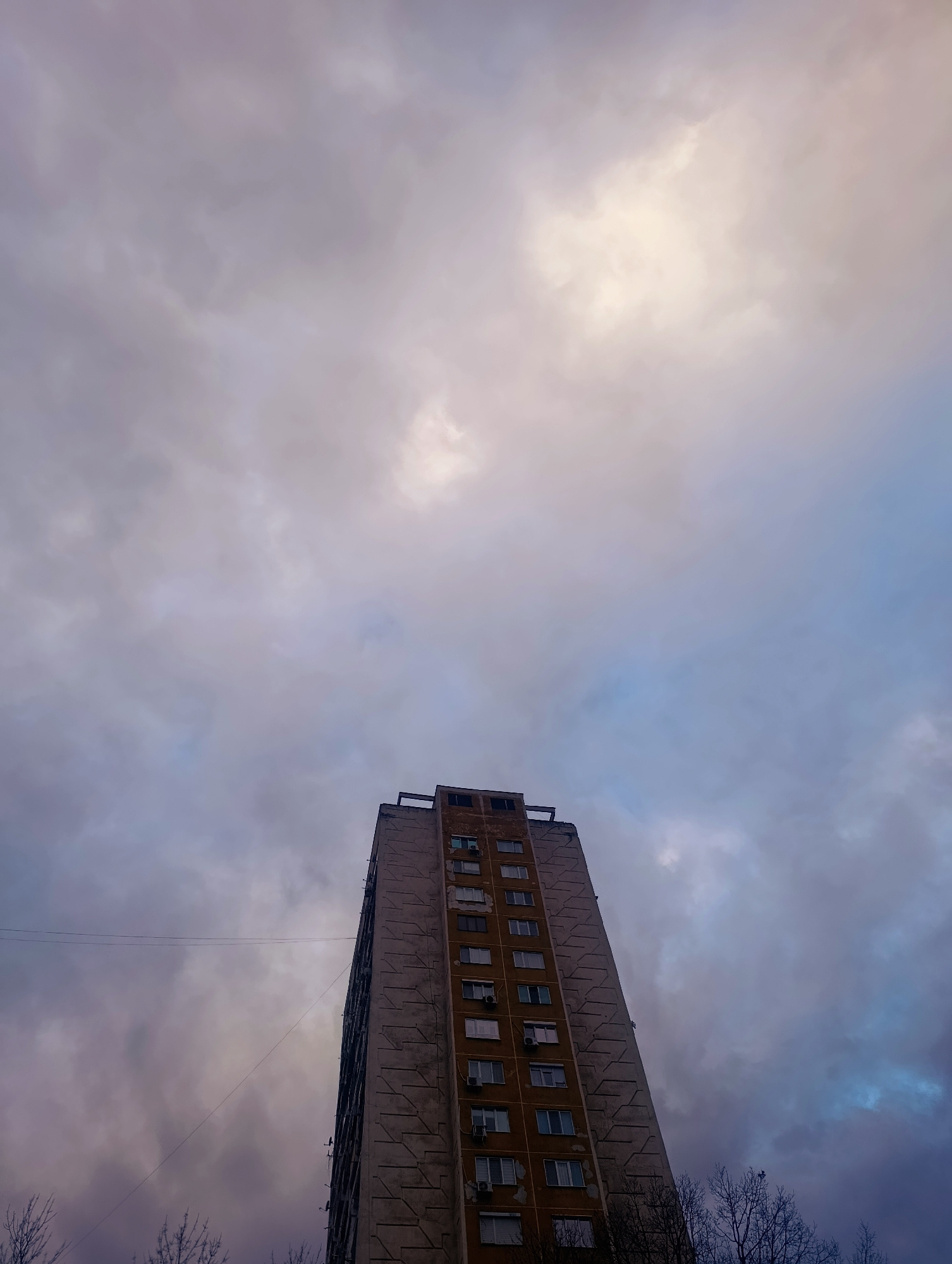 An upward angle shot depicts a tall building against a cloudy sky. The building, likely residential, features multiple rows of windows and a concrete facade that appears aged and somewhat weathered. S…read more