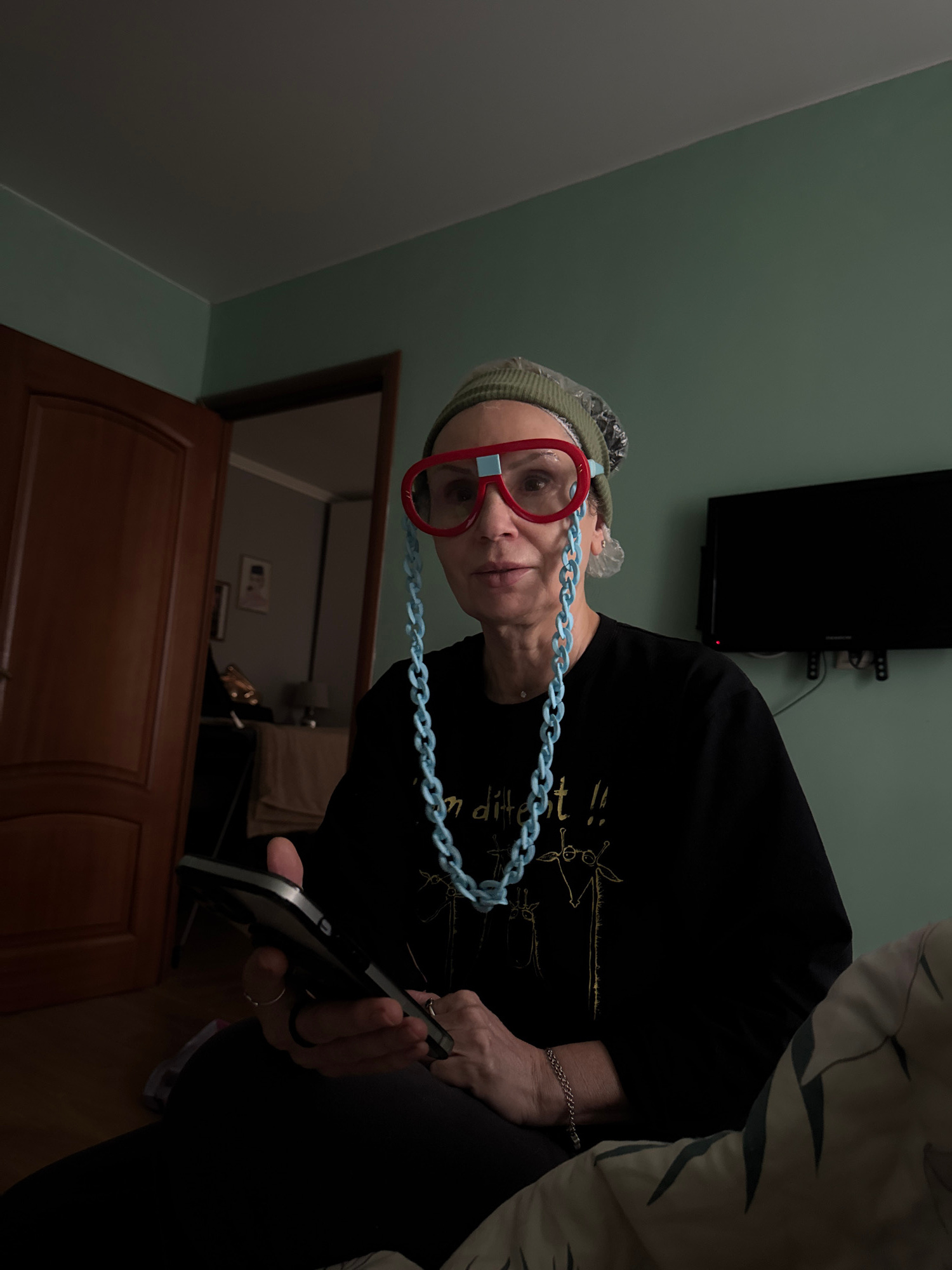 A person with a green beanie and red glasses with a blue chain sits on a bed in a room with green walls, holding a phone. A black television is mounted on the wall above a dark brown wooden door. The…read more