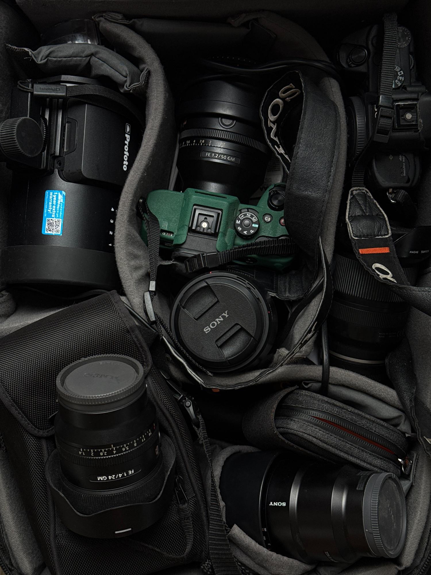 This top-down, high-angle shot captures a professional array of camera equipment neatly organized within a padded camera bag, suggesting preparation for a shoot or organized storage in Dubai, United A…read more