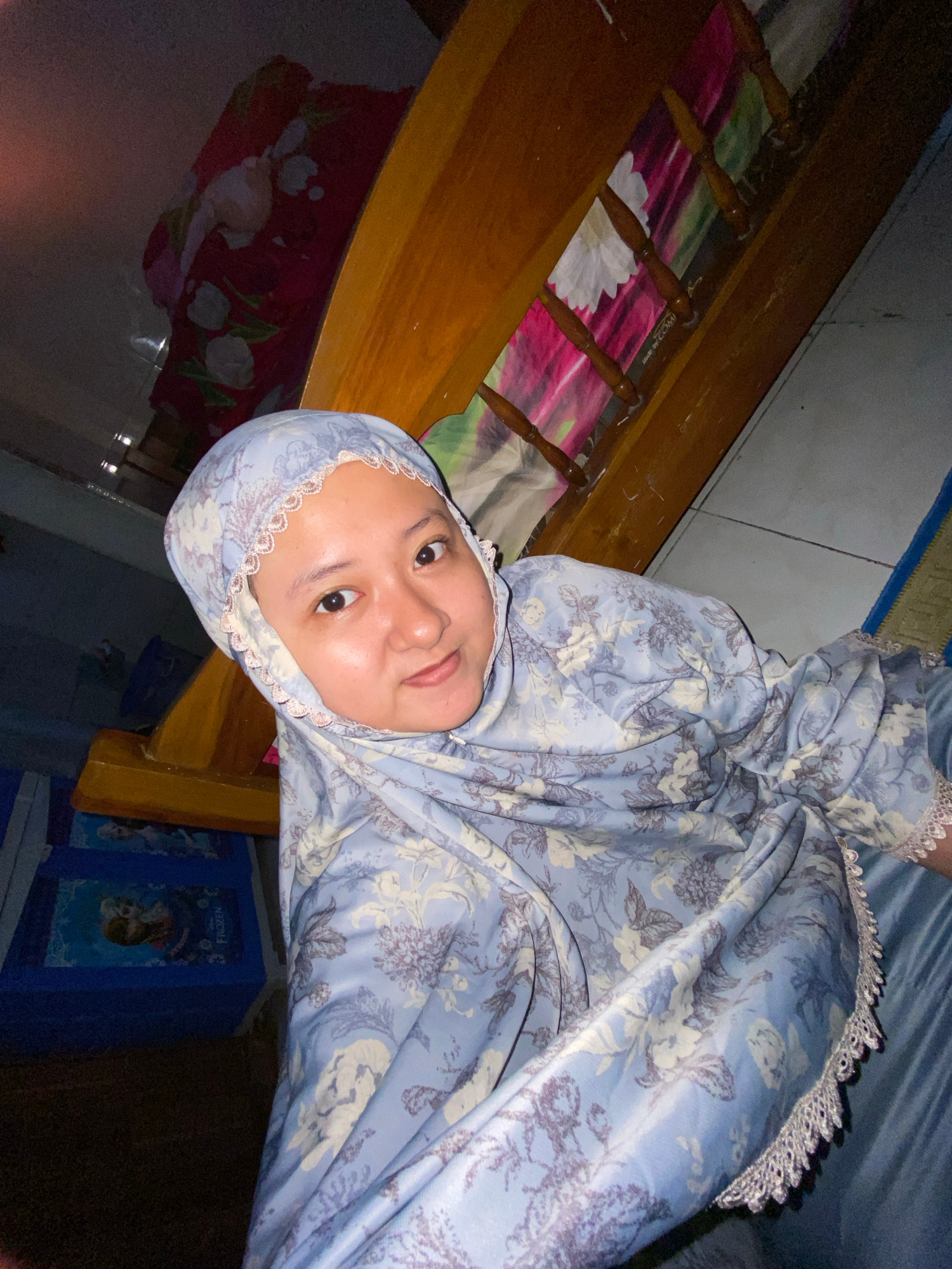 A person wearing a light blue floral hijab is in Gelam, Indonesia. The person is near a wooden bed frame with decorative spindles and a floral bedspread. A blue plastic container with the word "FROZEN…read more