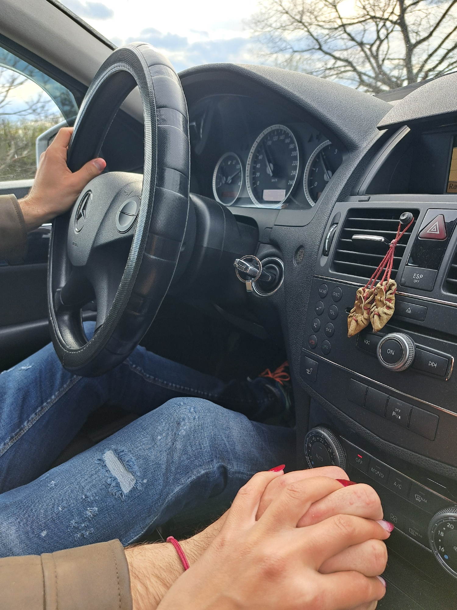 The image shows an interior view from inside a car, likely a Mercedes-Benz, given the steering wheel logo. The driver has their hand on the steering wheel, which has a black steering wheel cover. The…read more