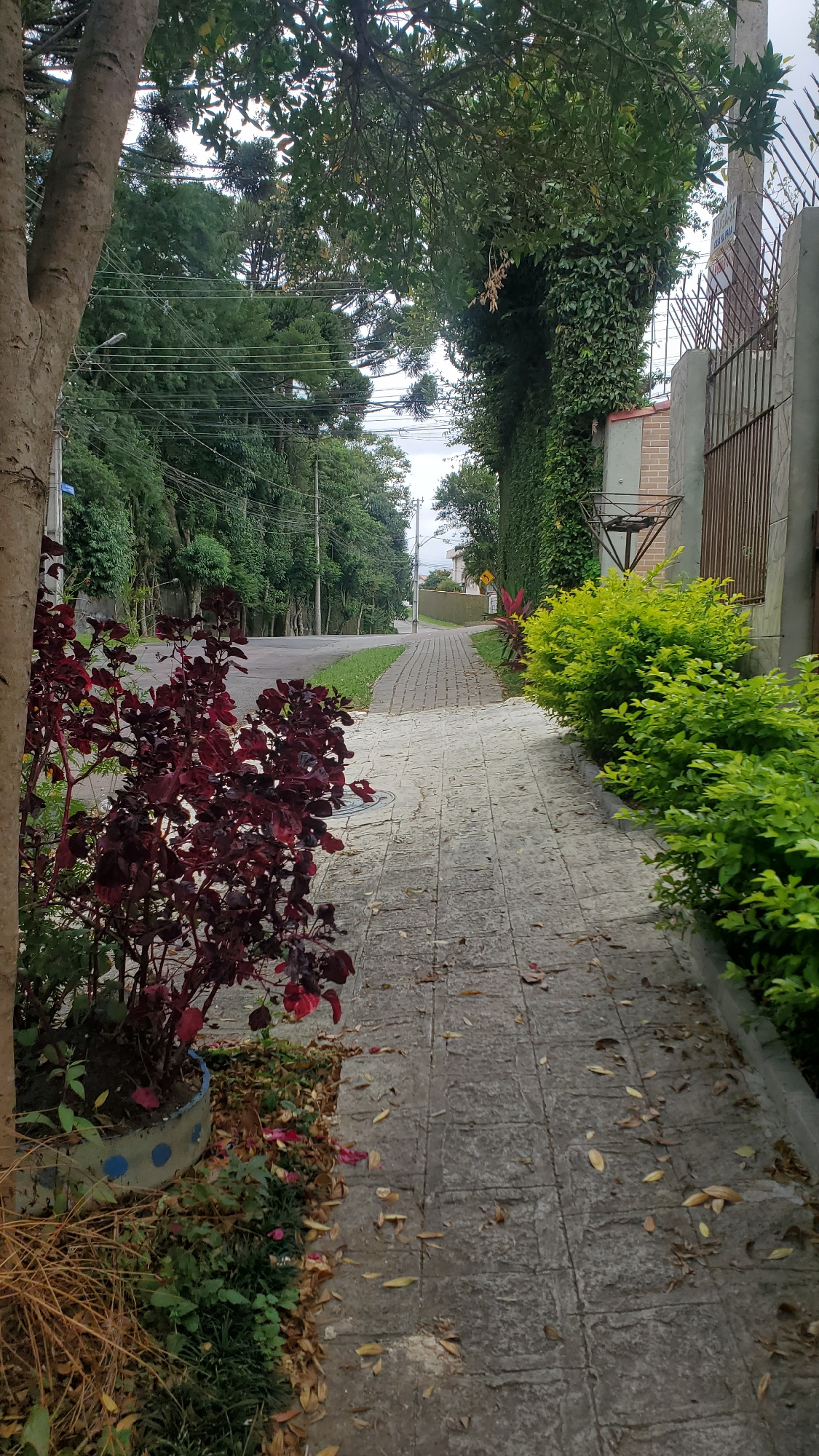 The image shows a tree-lined street in Curitiba, Brazil. A paved sidewalk runs along the right side of the street, with green and red vegetation bordering it. Leaves are scattered on the sidewalk. Bui…read more