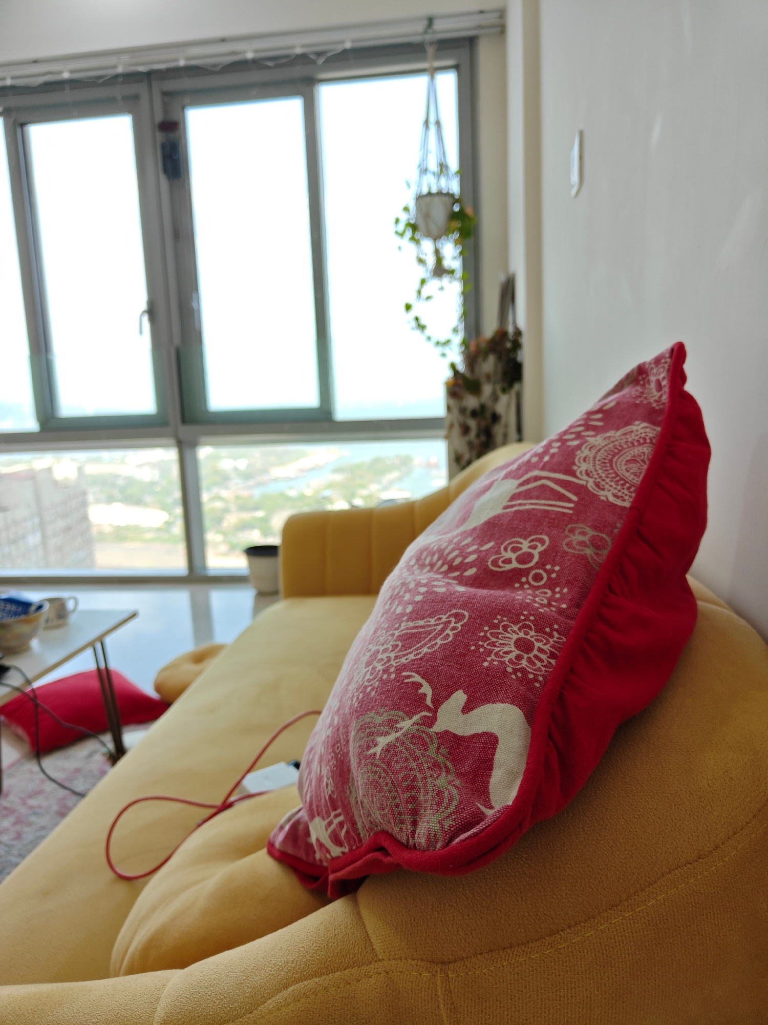 A medium shot focuses on a red and white decorative pillow placed on a yellow couch. The pillow is detailed with a complex pattern and a red ruffle trim. A thin red cable snakes across the couch towar…read more