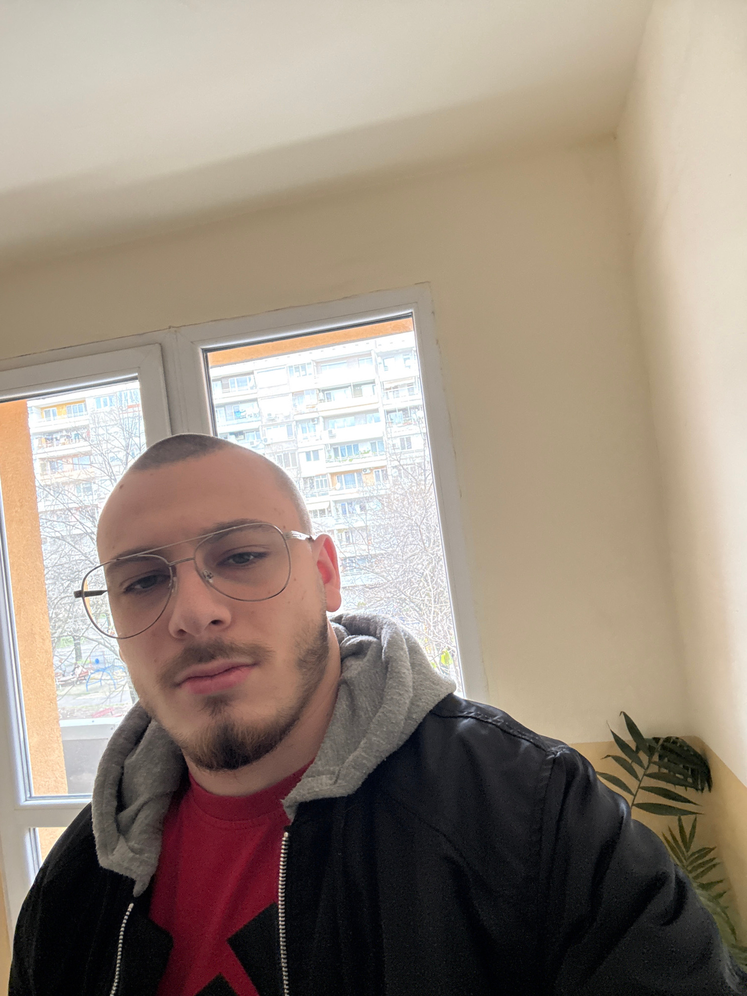A man with a bald head and beard, wearing round-framed glasses, a red shirt, and a black jacket with a gray hoodie, is positioned in front of a window. The window offers a view of a building exterior…read more