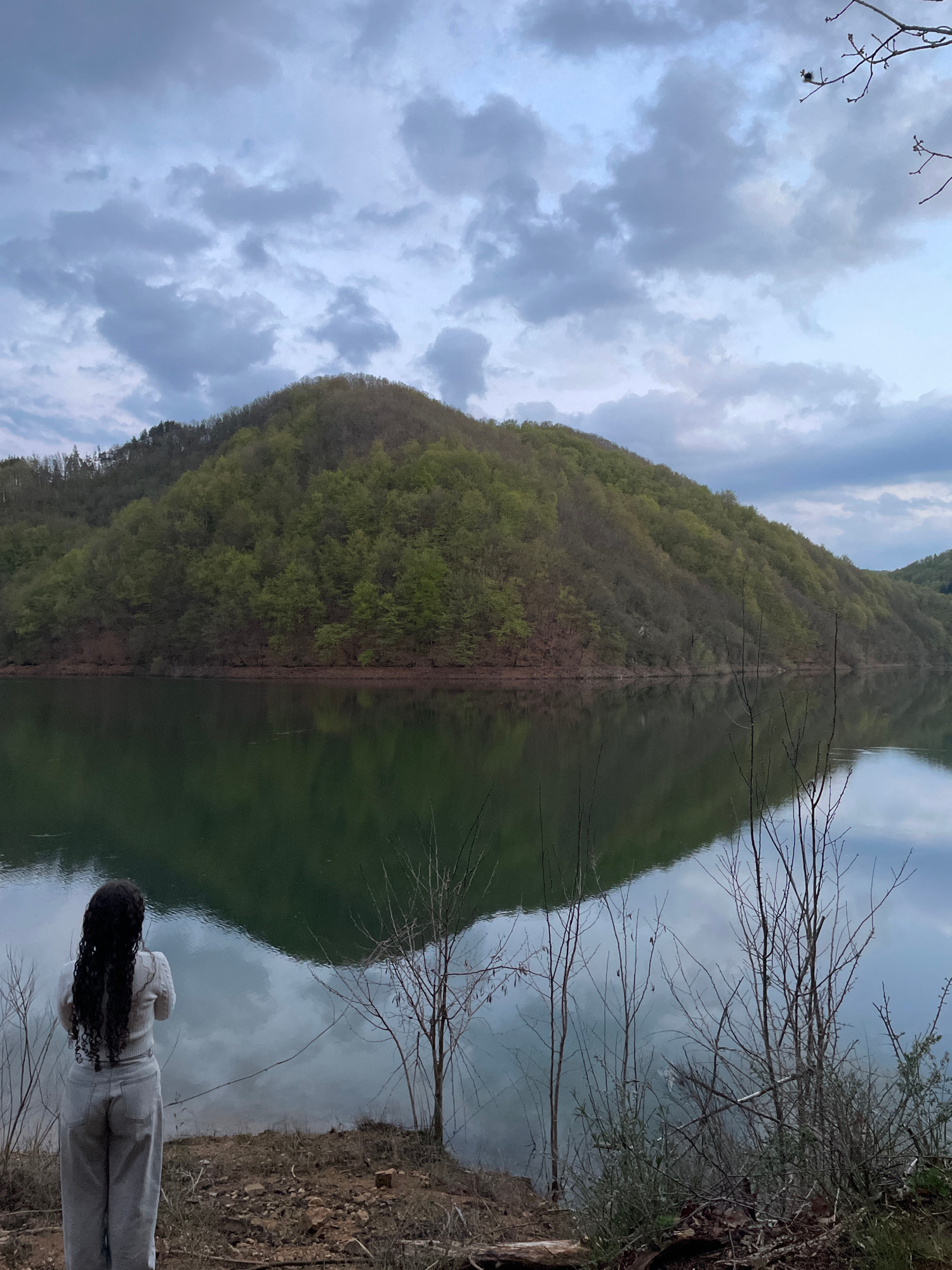 The image appears to be taken at a lake in Alamovtsi, Bulgaria. A mountain covered in green trees is reflected in the still water, creating a symmetrical image. Overcast sky with clouds is visible abo…read more