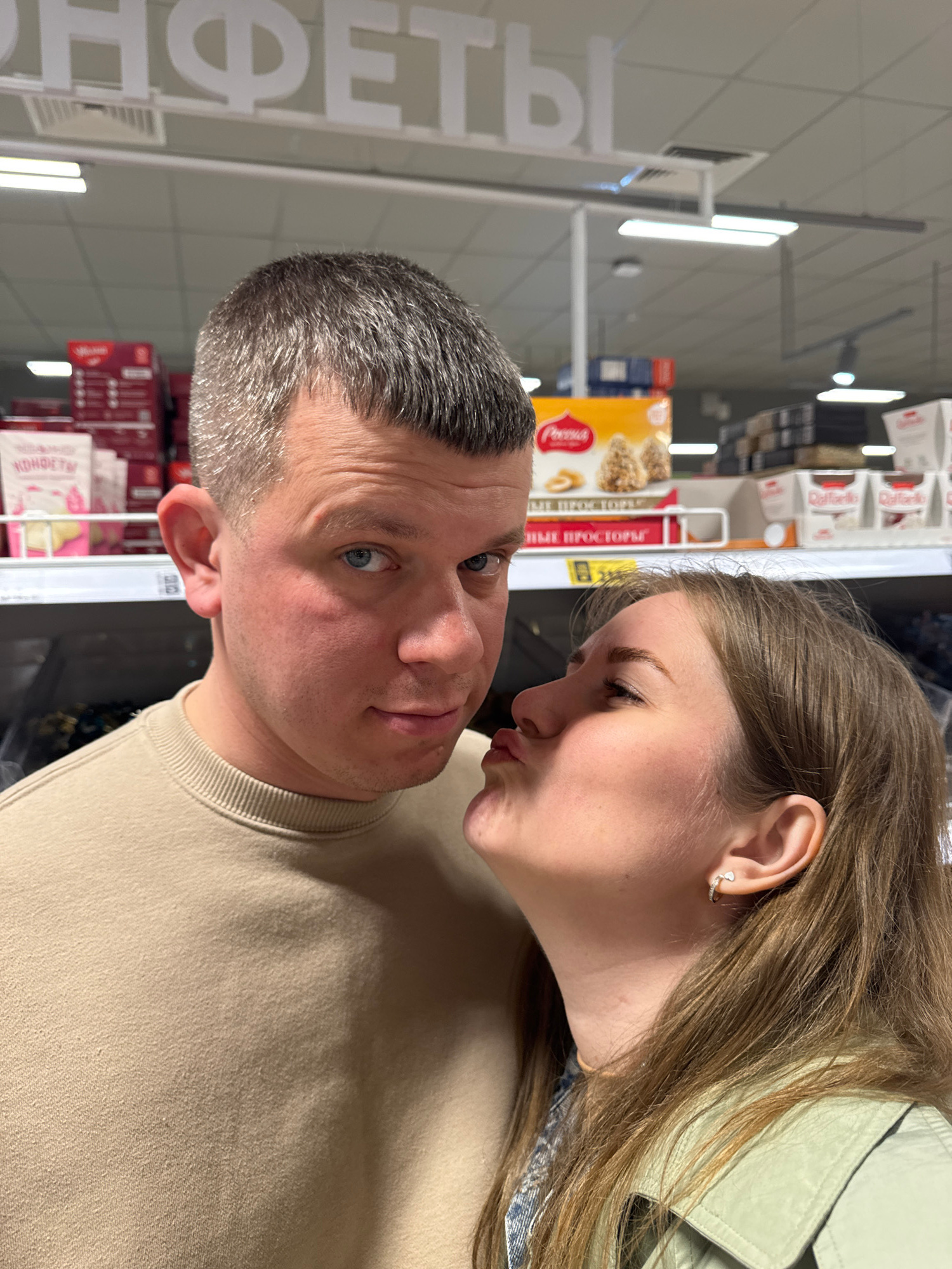 A man and a woman are posing close together in a store aisle. The woman appears to be playfully trying to kiss the man's cheek. They are surrounded by shelves stocked with various packaged goods. The…read more