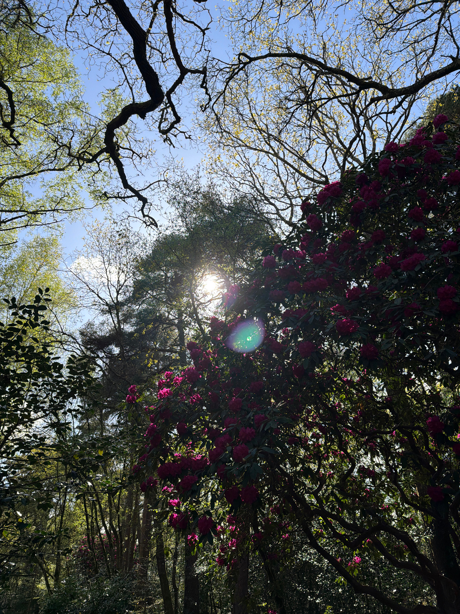 The image, when viewed as if rotated counter-clockwise, depicts an upward-looking perspective into a diverse woodland canopy on a bright, sunny day. A clear blue sky is visible through gaps in the den…read more