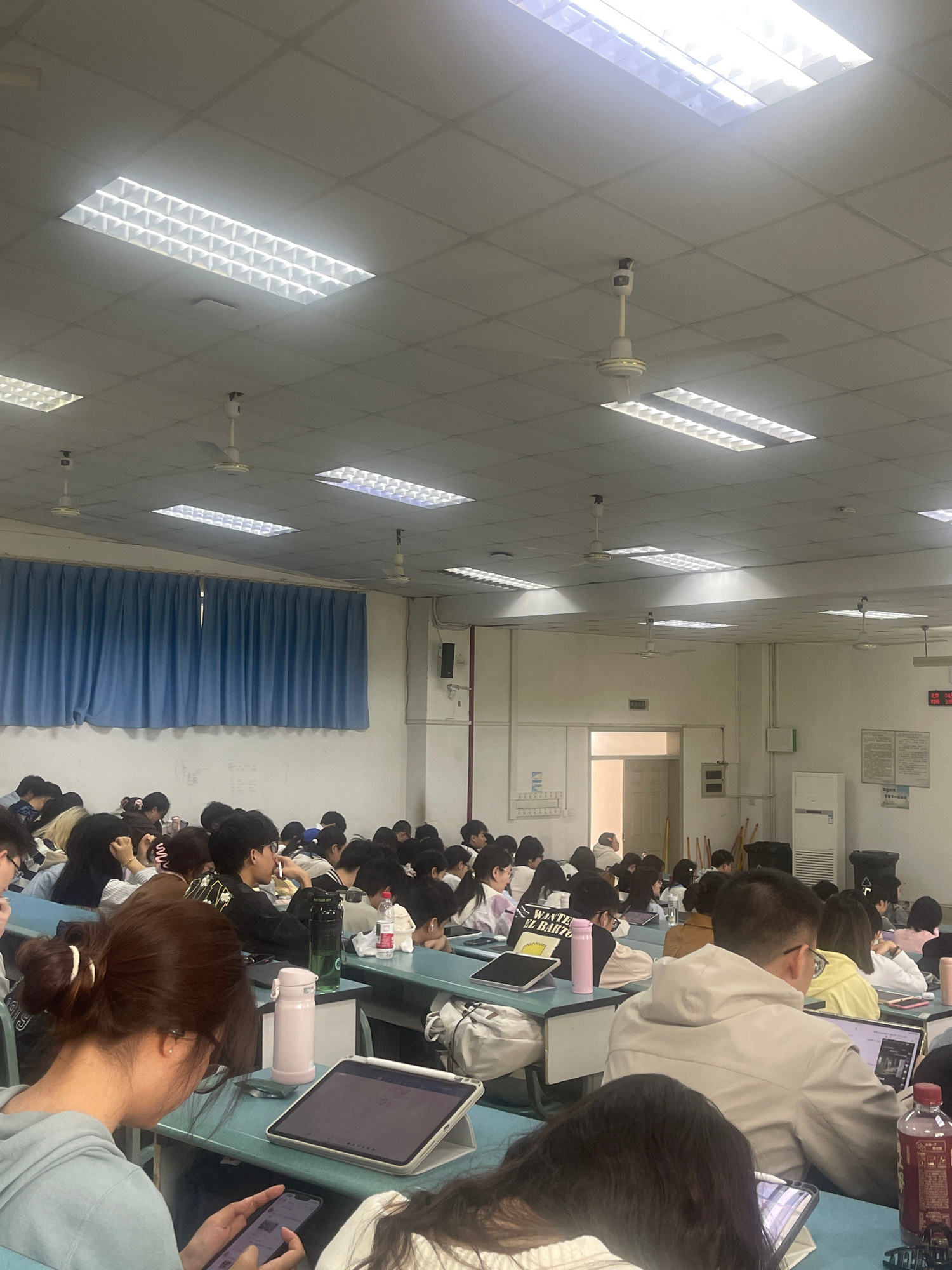 A brightly lit indoor classroom scene in Chongqing High-tech Zone, China, showing a long row of students seated at tables. Most students are looking down at electronic devices, possibly tablets or lap…read more