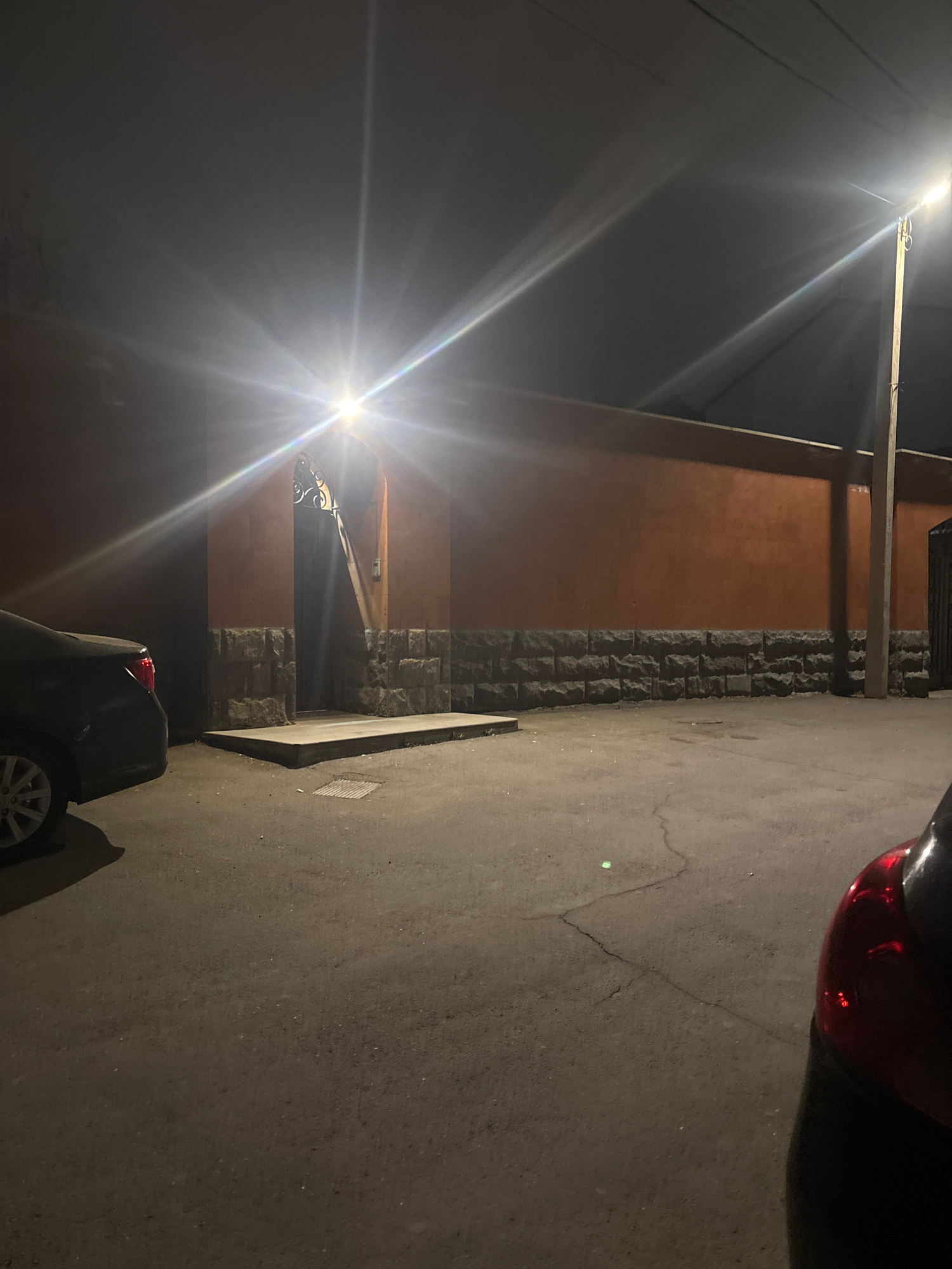 The image depicts a night scene in Yerevan, Armenia, near a building with an orange wall and stone trim. The street is illuminated by a bright street lamp, creating a strong glare. Two cars are partia…read more
