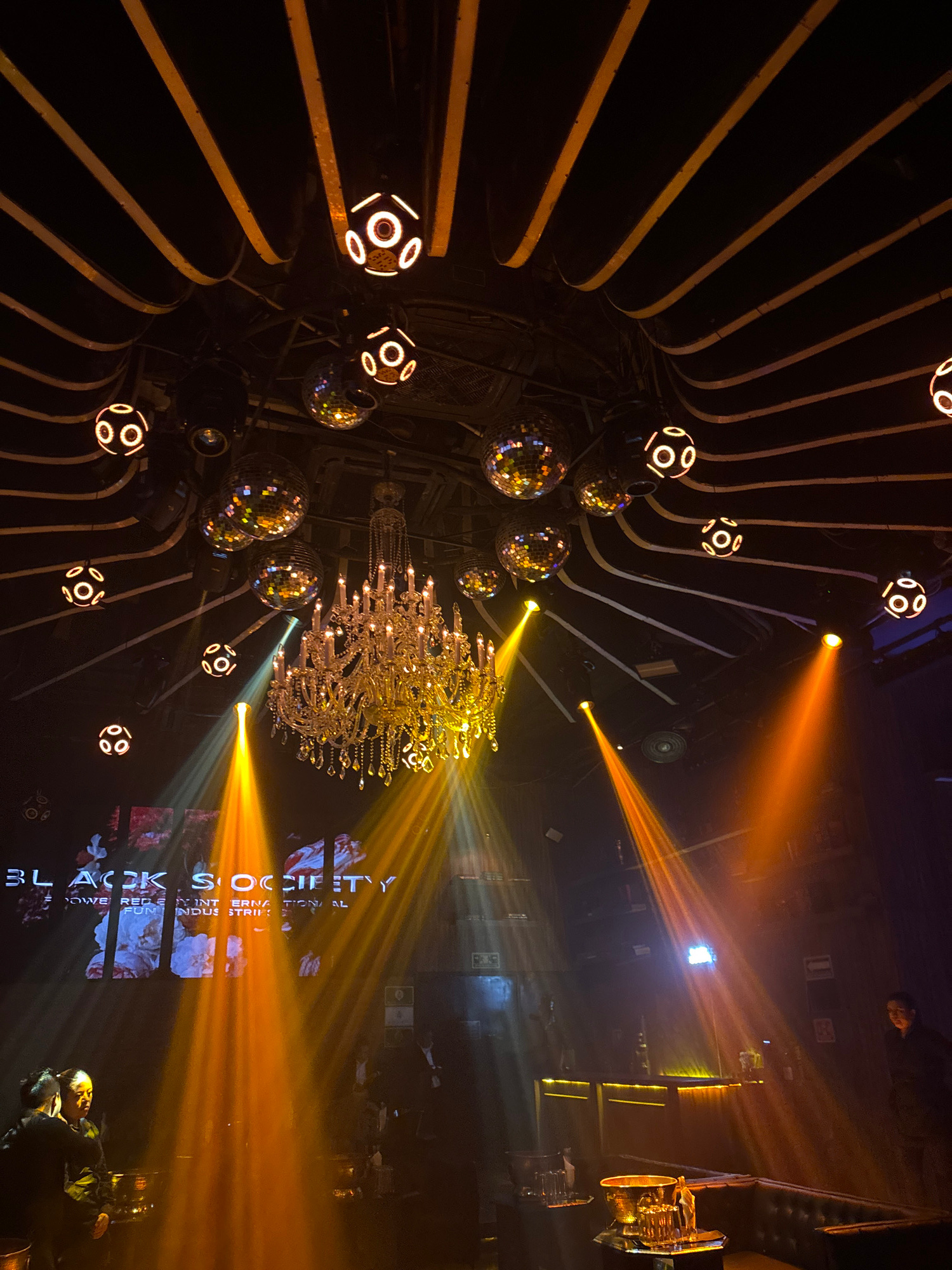 The image depicts the interior of a bar/club environment, likely in Puebla, Mexico. The space features a decorative ceiling with curved, parallel panels interspersed with disco balls and illuminated s…read more