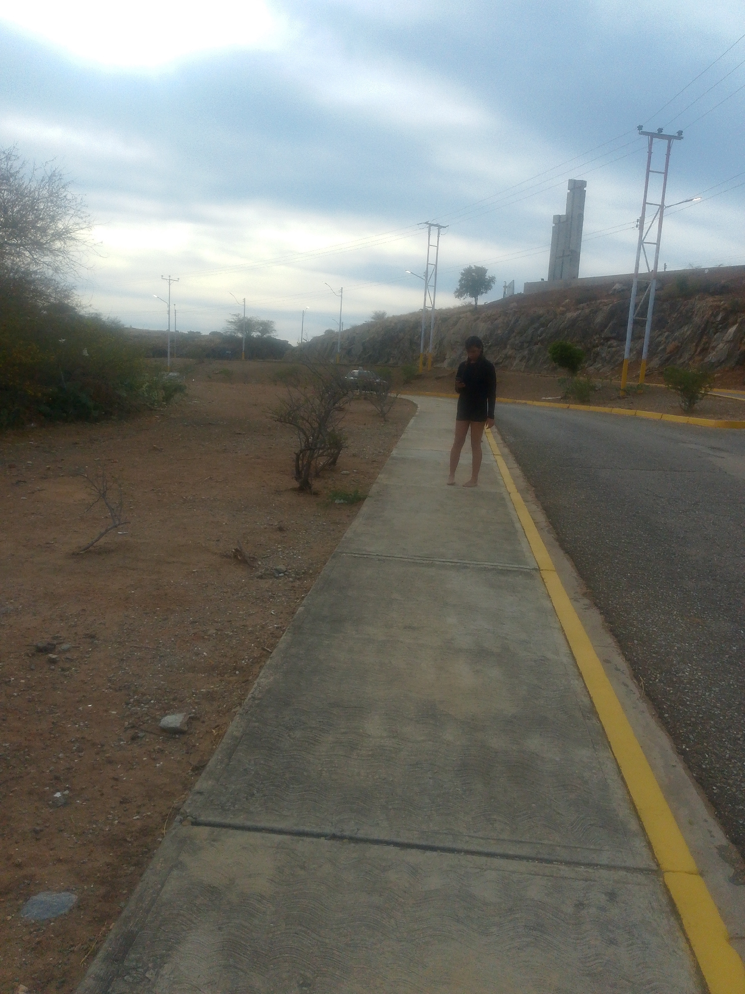 The image depicts a street scene in Juan Griego, Venezuela. A person is standing barefoot on a concrete sidewalk next to a road. The person is wearing a long-sleeved dark-colored shirt or jacket and a…read more