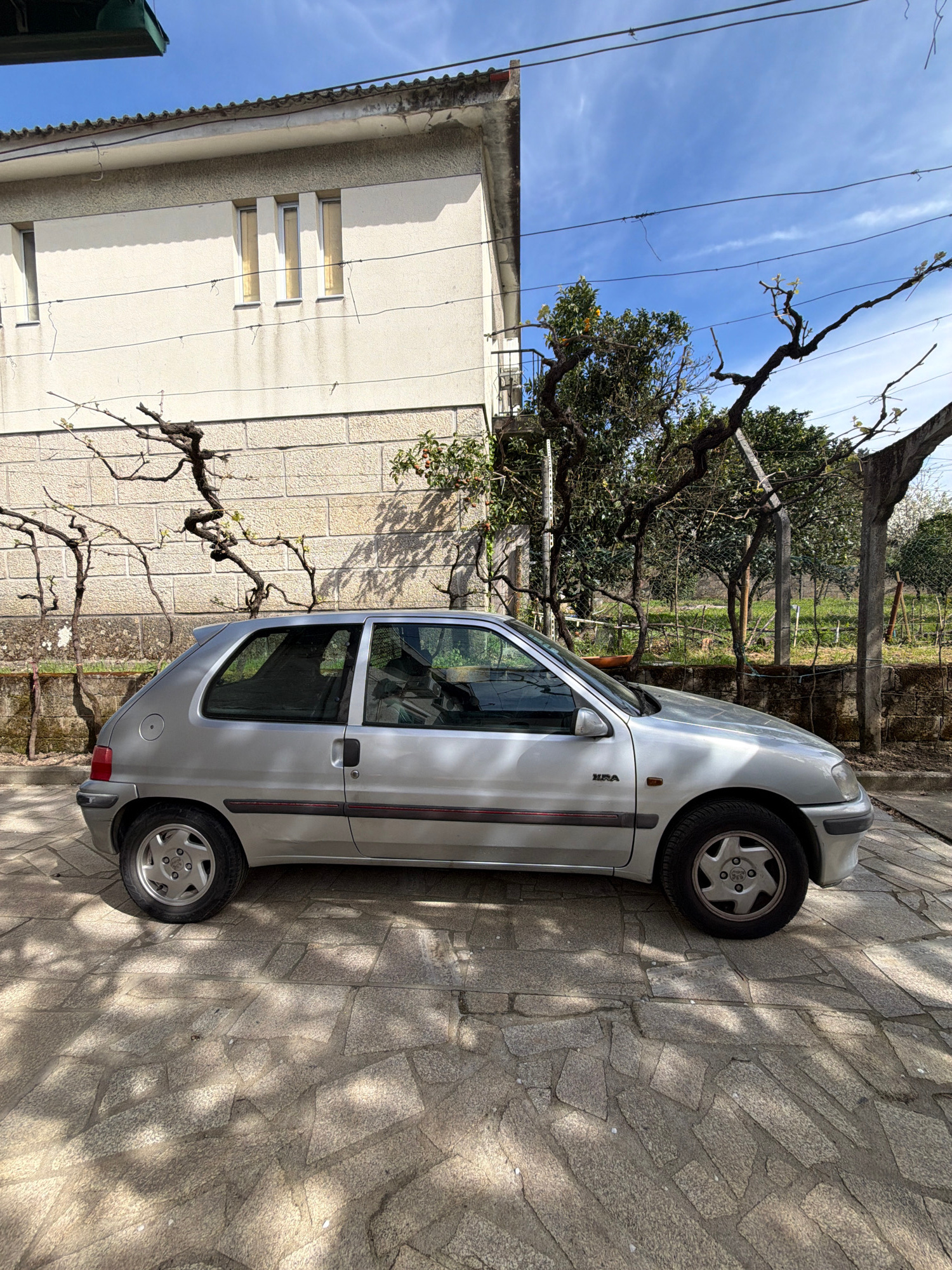 The image shows a silver SEAT Arosa parked on a stone-paved surface next to a two-story building with three narrow windows on the first floor. A bare vine is growing along the wall of the building. In…read more