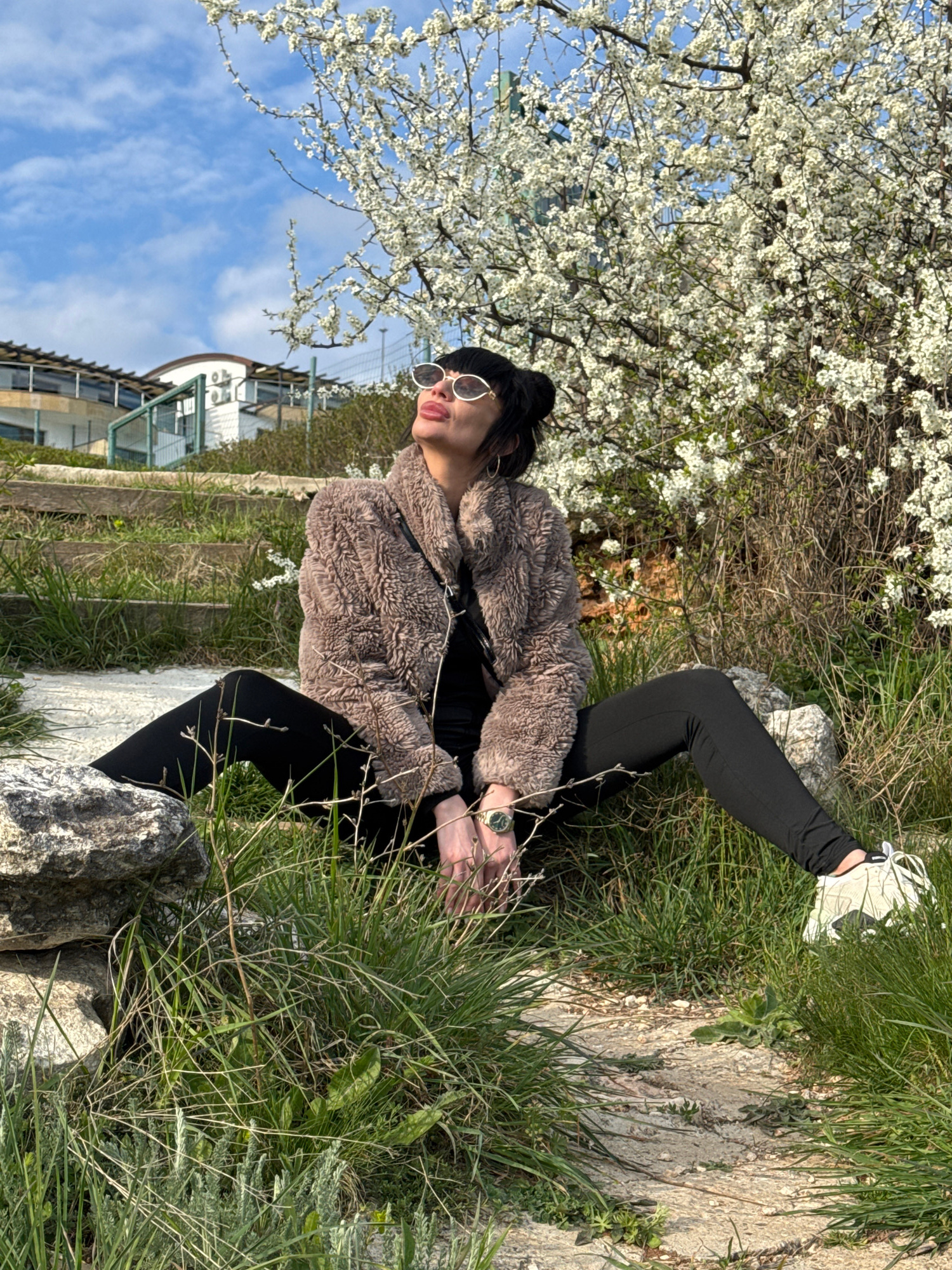 A woman is outdoors sitting in the grass near a flowering tree. She is wearing a dark beanie, round sunglasses, a fuzzy brown jacket, black pants, and white sneakers. Her left leg is outstretched and…read more