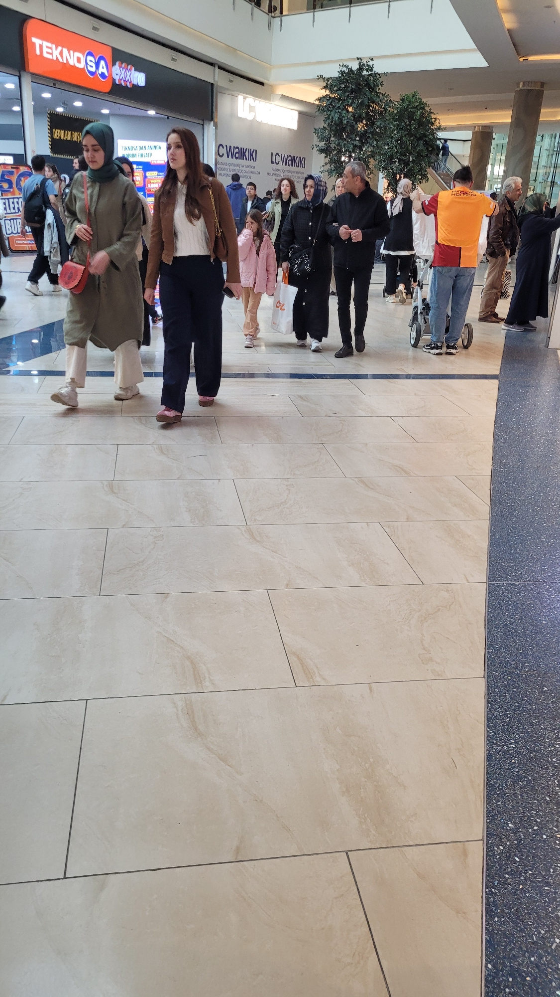 Here is a detailed description of the image: The image shows the interior of a shopping mall in Başakşehir, Turkey. A line of people are standing, with shops visible on one side. There are at least t…read more
