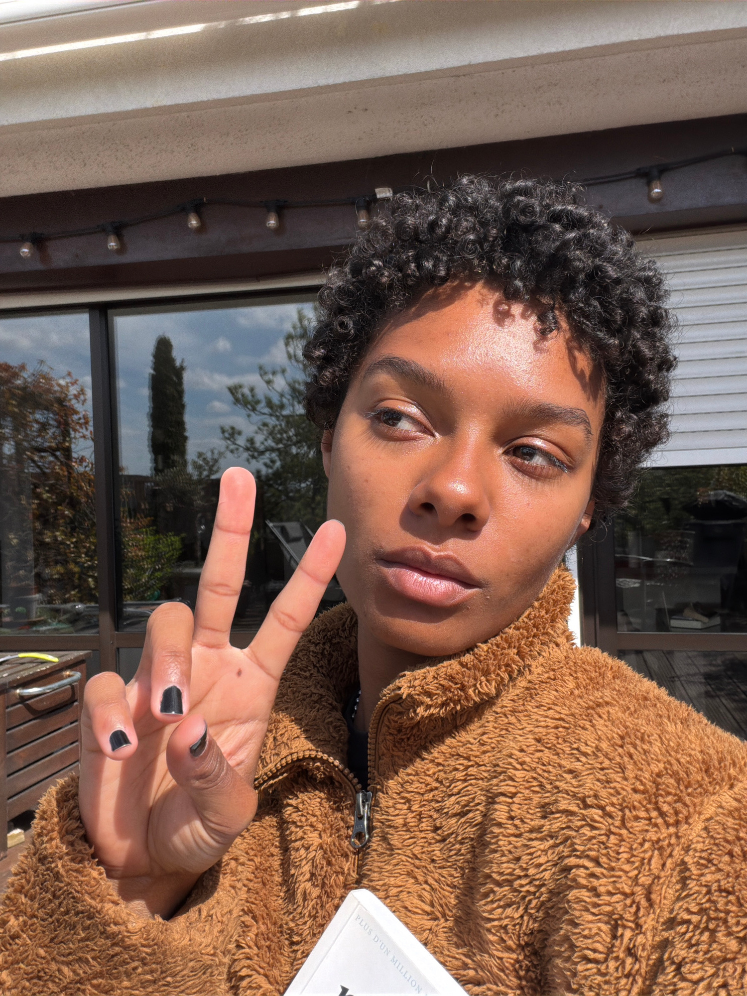 A young individual with dark, curly hair and warm brown skin is captured in a close-up portrait, oriented vertically. The subject is outdoors, posing in bright, direct sunlight, which creates strong h…read more