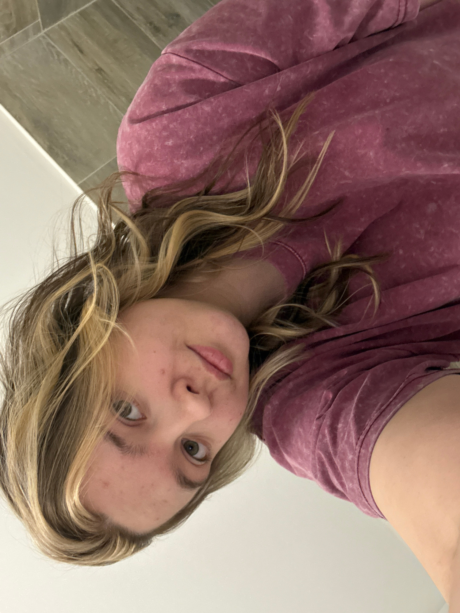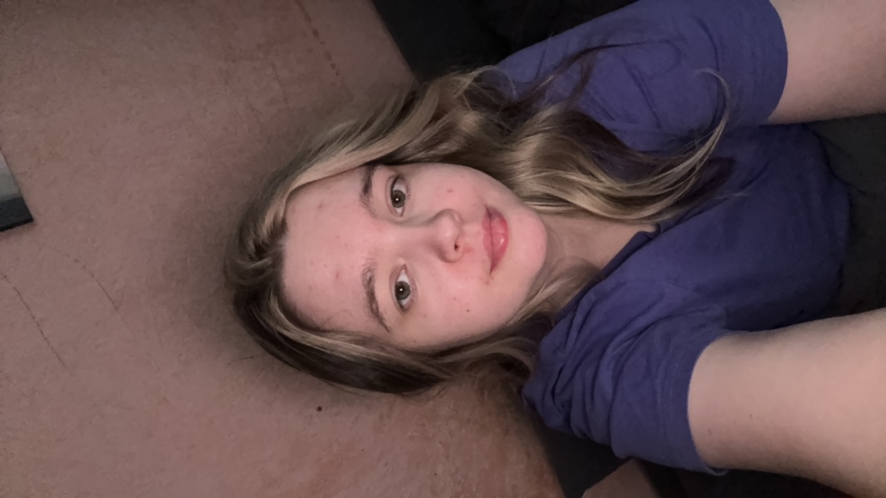 A close-up selfie captures a young individual, likely female, lying down and looking directly upwards towards the camera. Their face, slightly angled, shows light-colored eyes (appearing hazel or ligh…read more