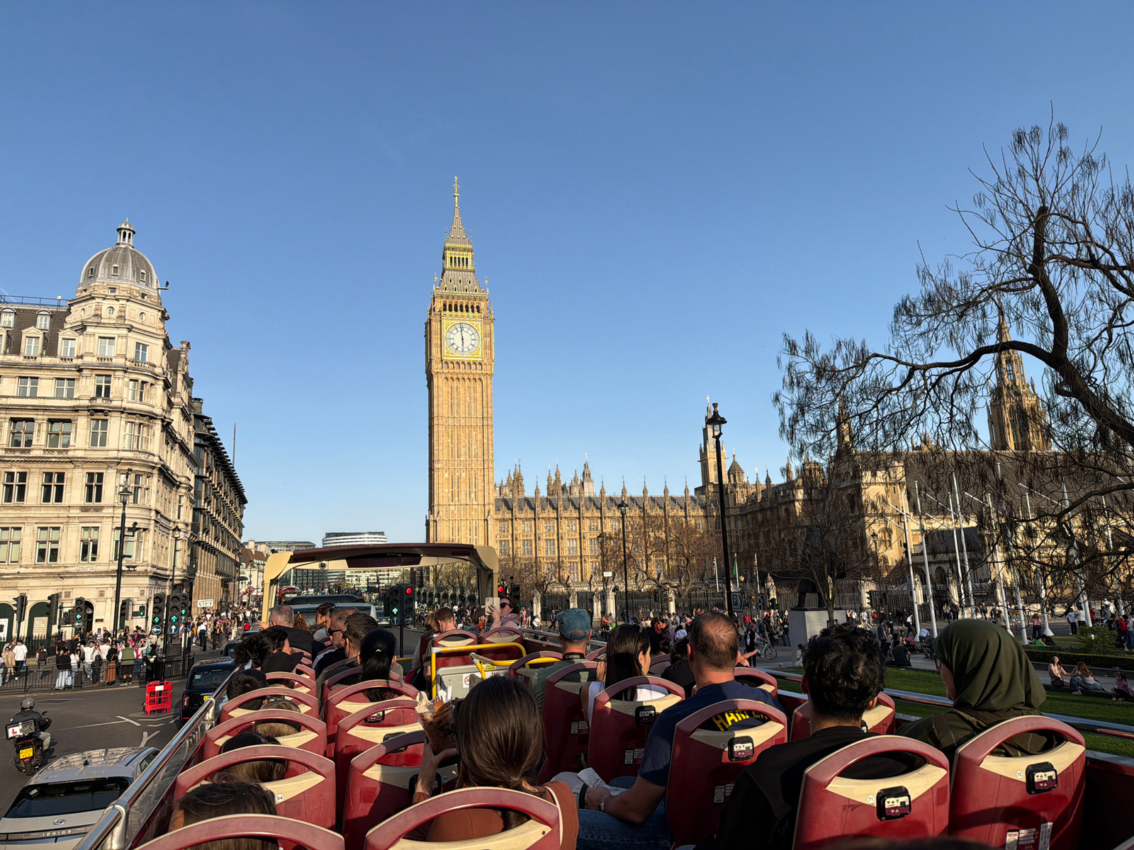The image shows a view from the upper deck of a red open-top tour bus in London, United Kingdom. The bus is filled with passengers, with the backs of their heads and shoulders visible. In the backgrou…read more