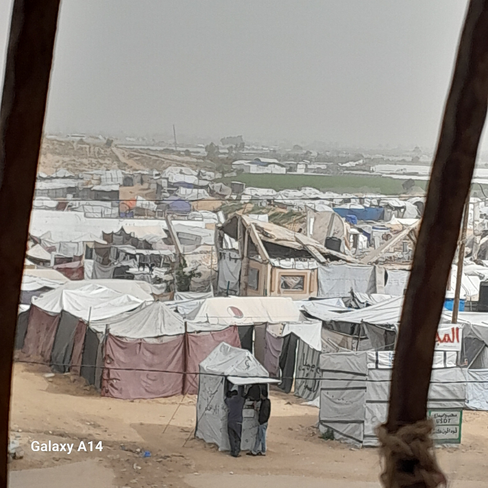 The image shows a densely packed refugee camp in Khan Yunis, Palestinian Territory. Numerous makeshift shelters, predominantly white and grey, are crowded together, made from various materials like fa…read more