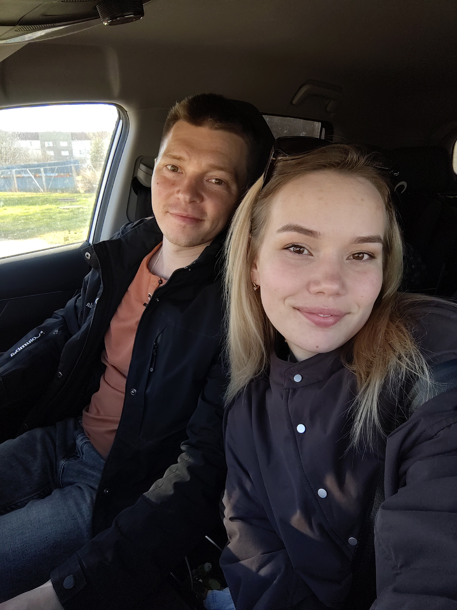 A medium-close-up, eye-level selfie captures a man and a woman seated in the front passenger and driver's seats of a car, respectively. The setting is bright daylight, suggesting a sunny day, with the…read more