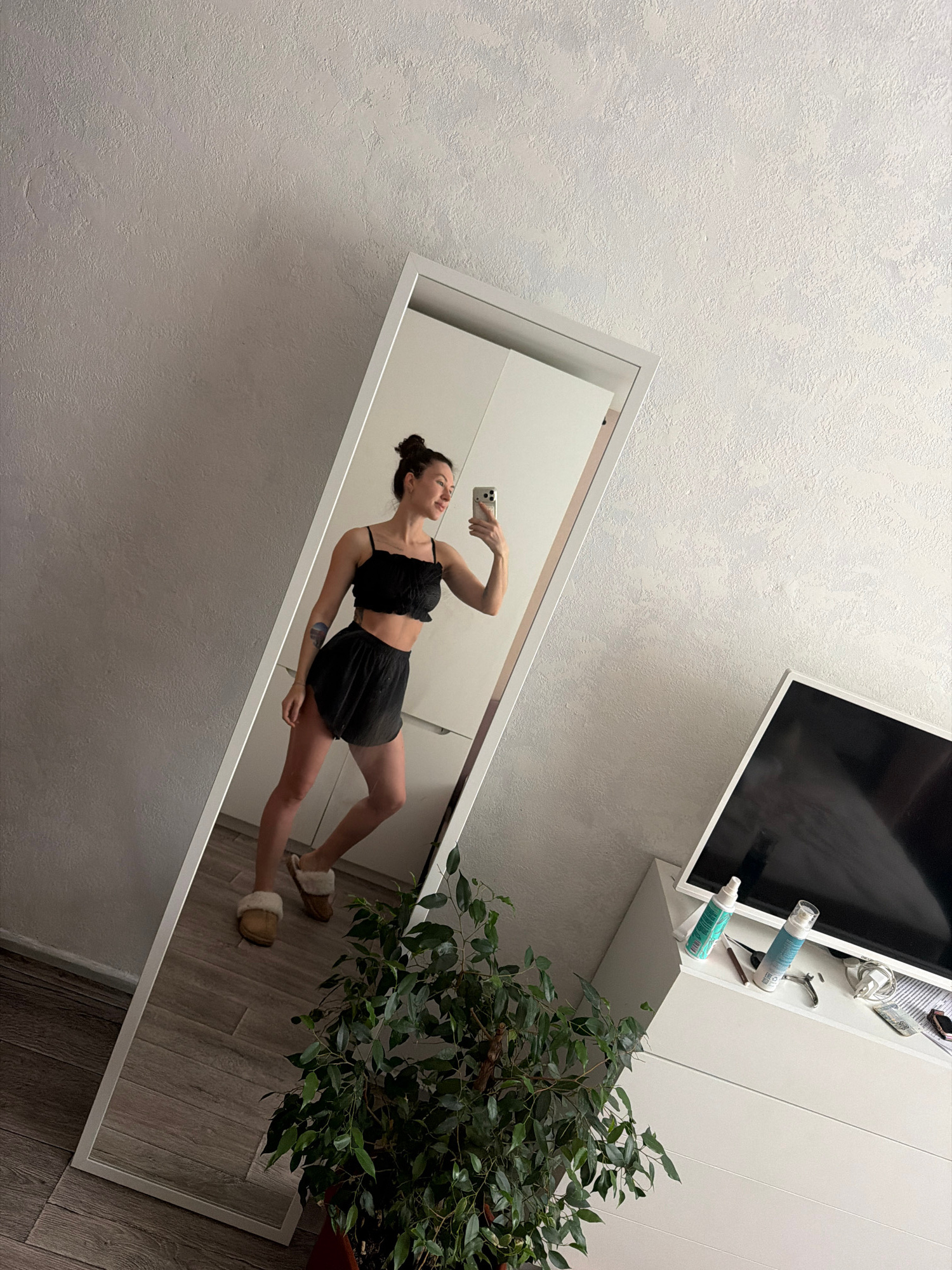 This indoor full-body mirror selfie features a woman in a casual setting in Perm, Russia. The perspective is tilted, with the white-framed mirror angled against a light-colored, textured wall. The ce…read more